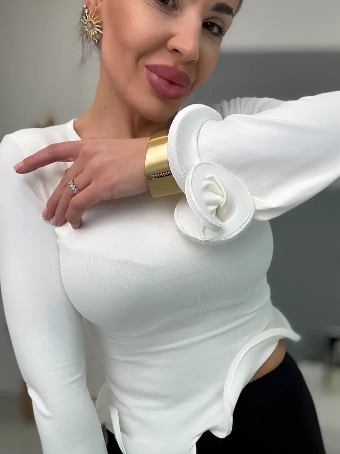 Asymetrický top s tvarovanými volánmi. Špeciálny kúsok, ktorý oživí každý outfit.