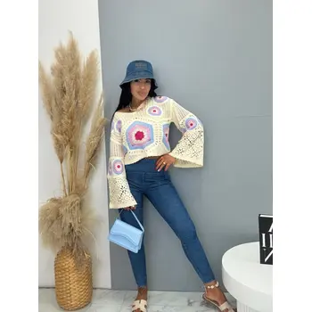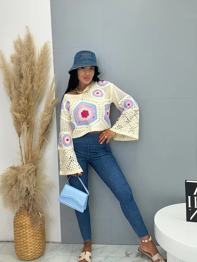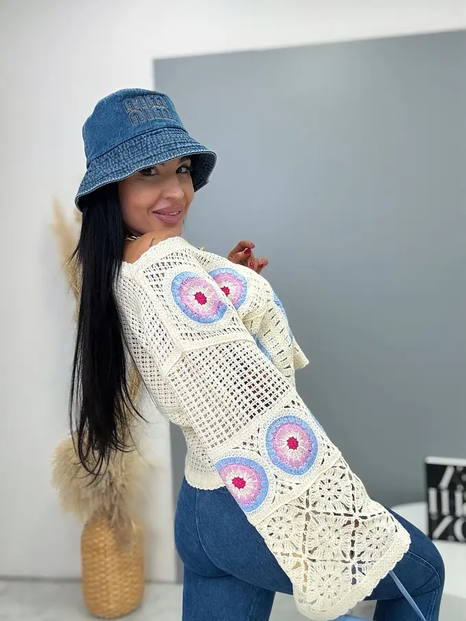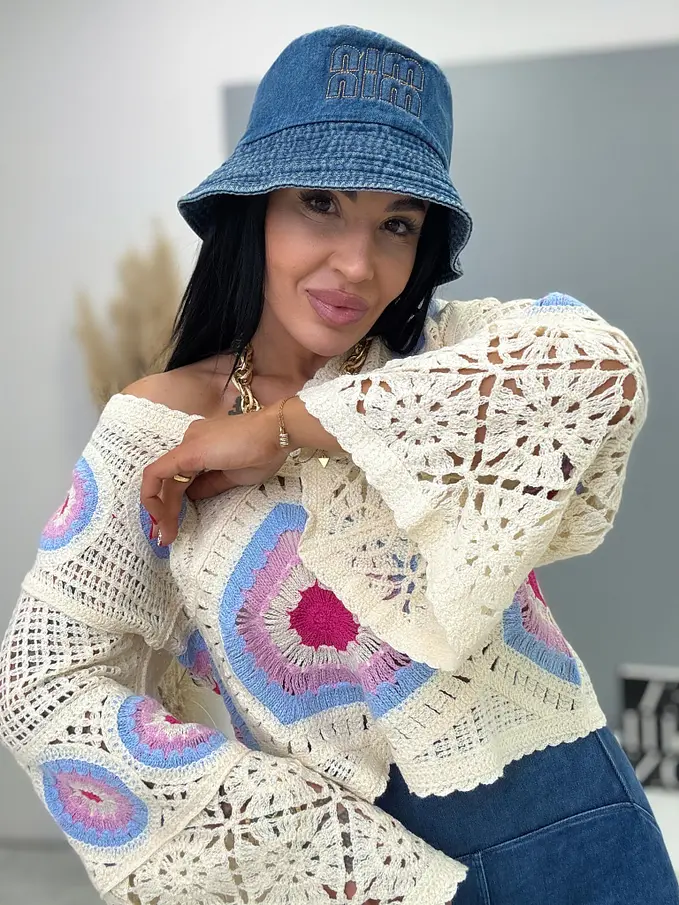 Mäkký sveter s výstrihom do V a výrazným ažúrovým vzorom. Tento sveter má kratšiu dĺžku a širšie rukávy.