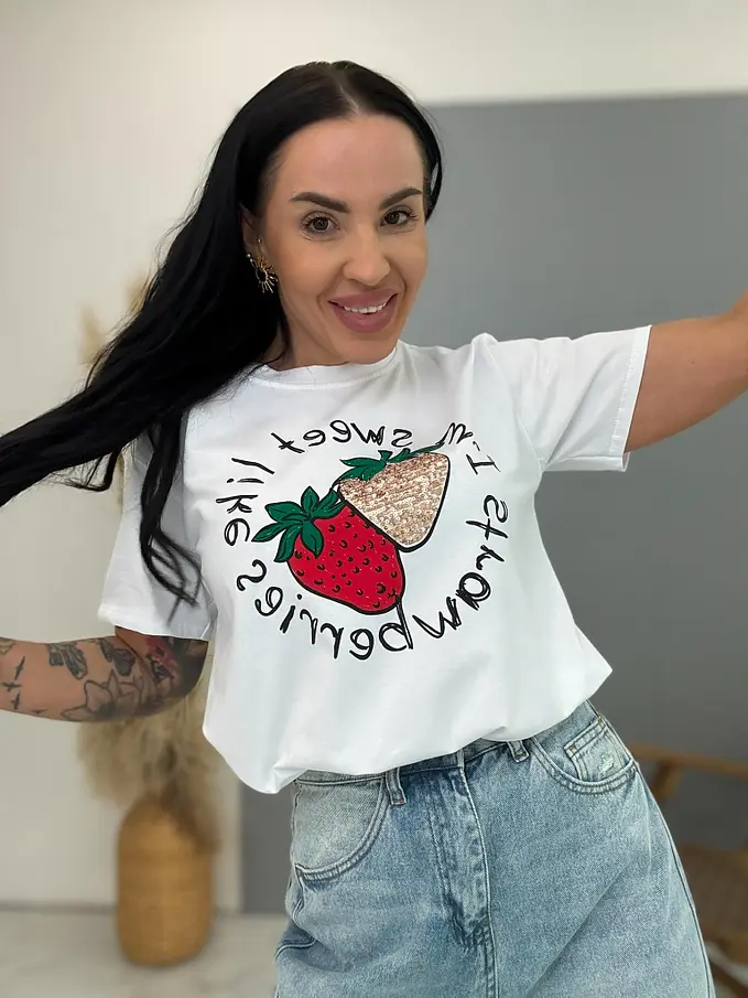 Biele tričko s flitrovým zdobením a potlačou STRAWBERRY