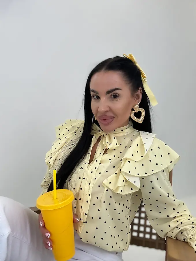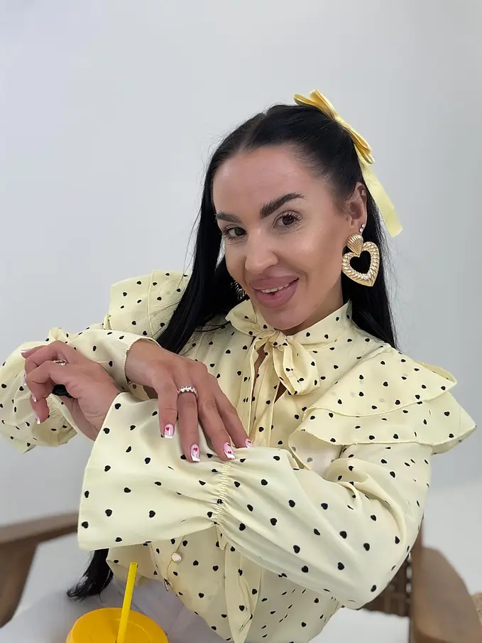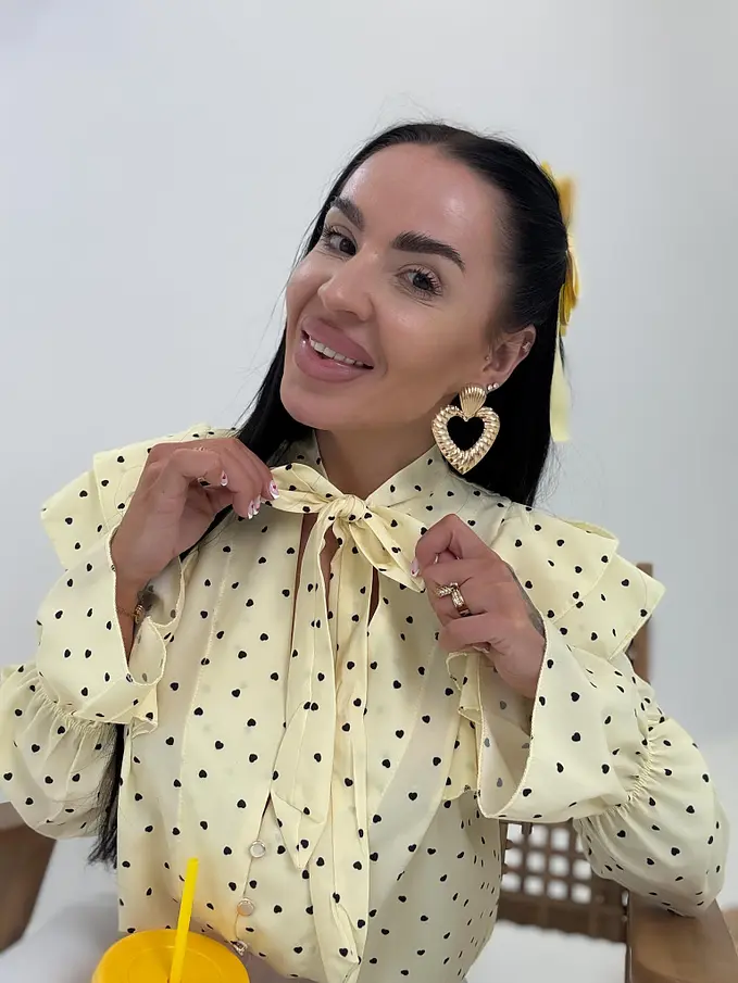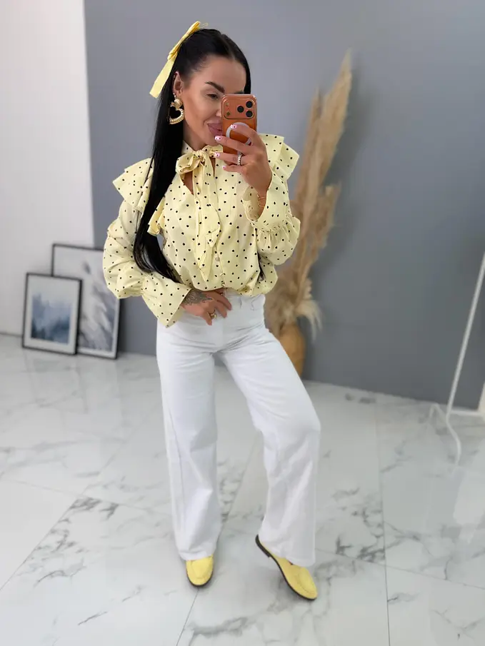 Táto ženská a hravá blúzka je ideálna na jarné a letné outfity. Gombíky majú zlatú farbu.