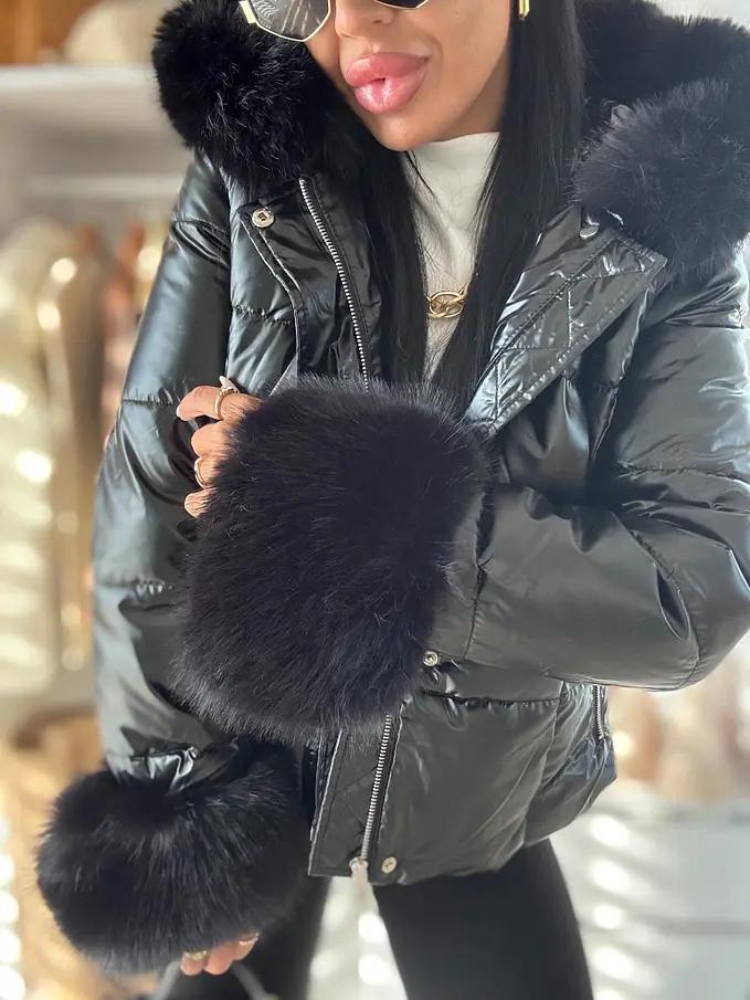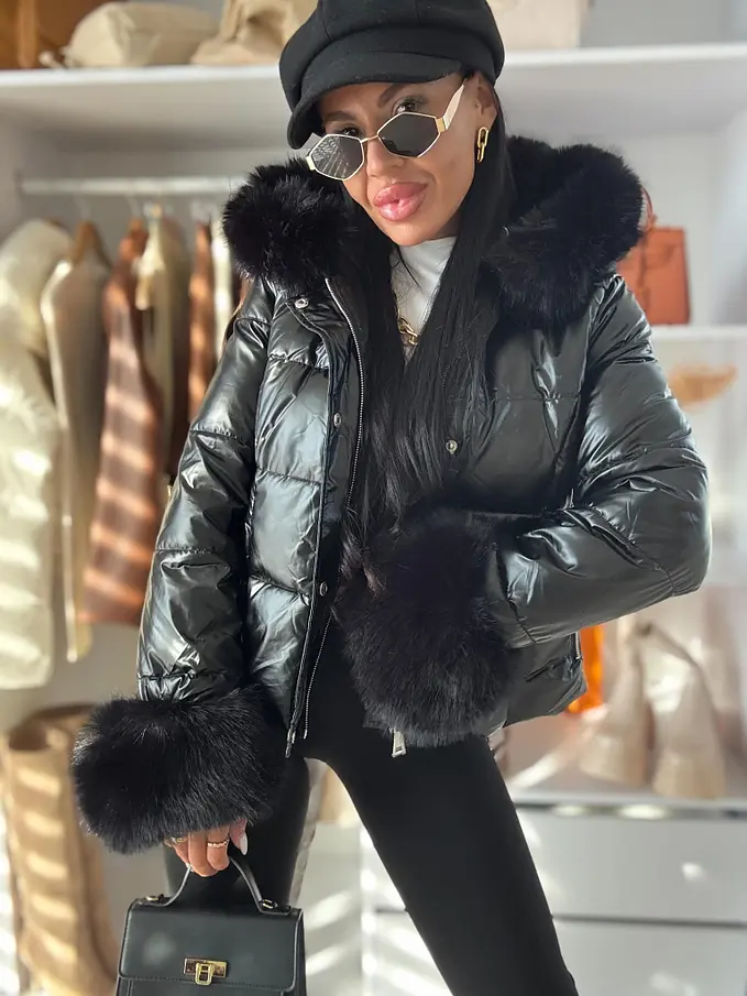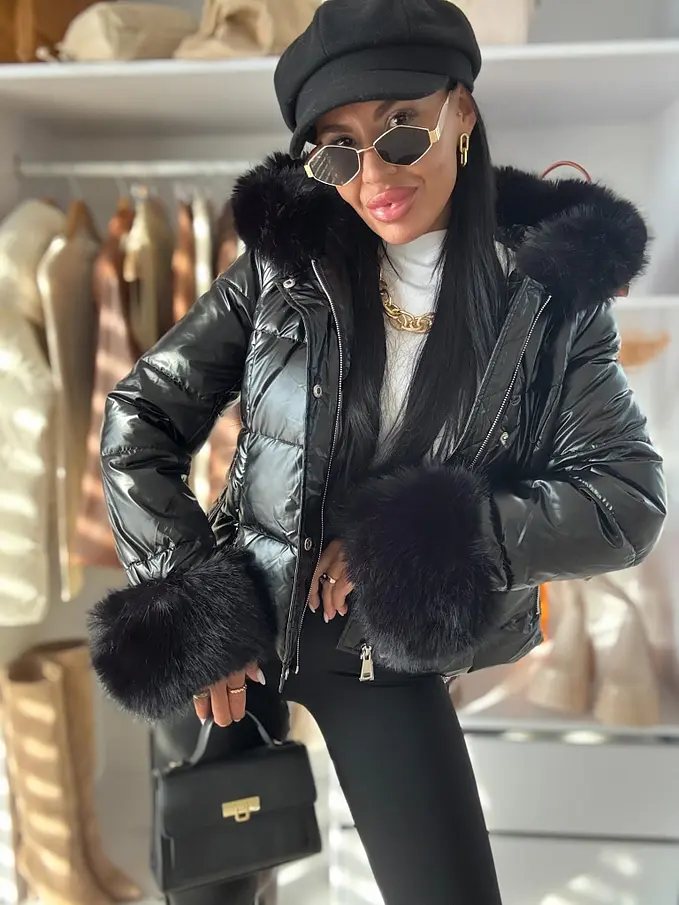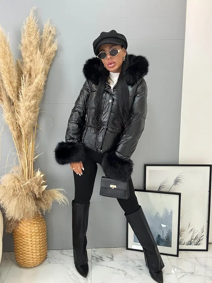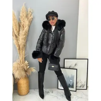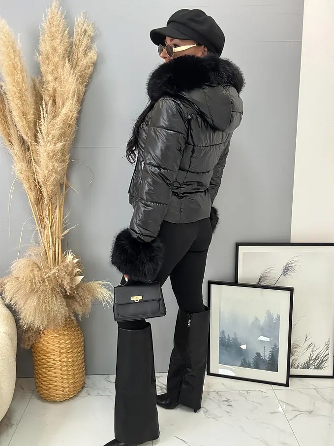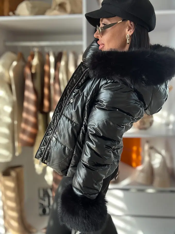 Materiál nie je elastický.Kabát sa zapína na zips a cvoky. Kapucňa je neodnímateľná. S odnímateľným kožušinovým lemom na golieri a rukávoch. Ozdoby sú strieborné.