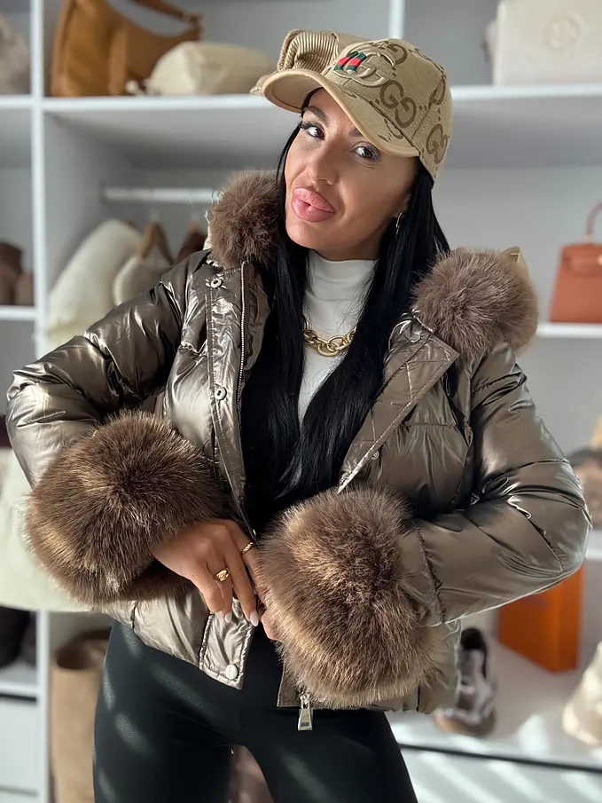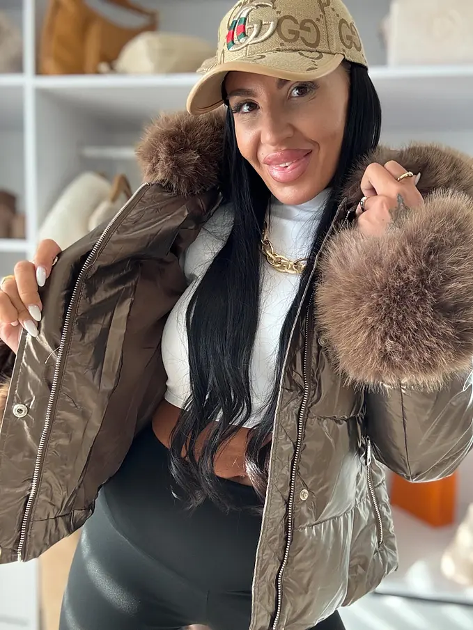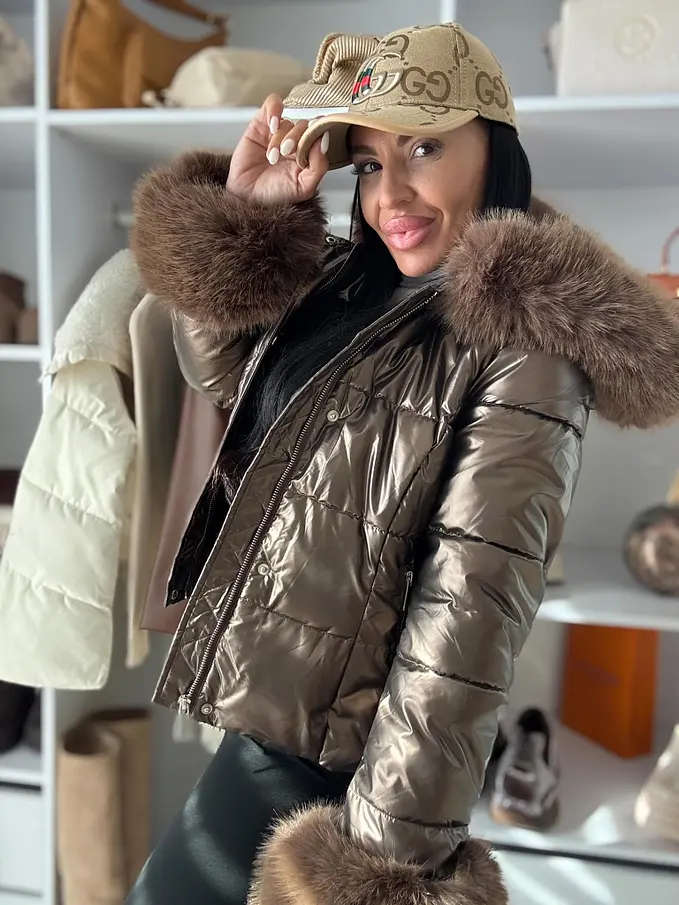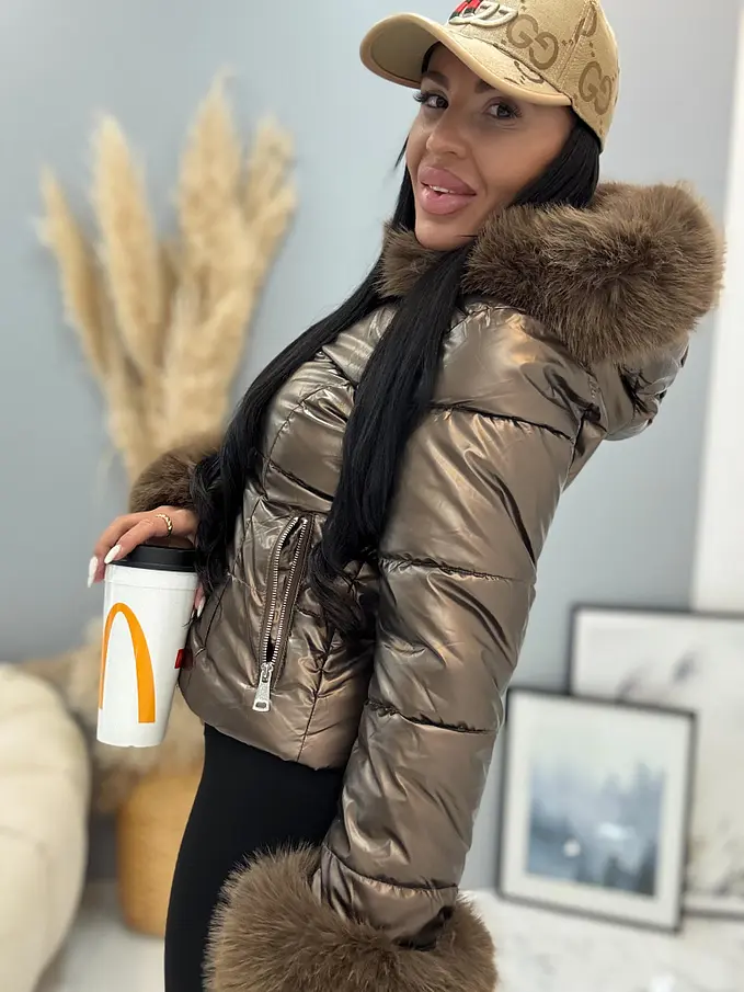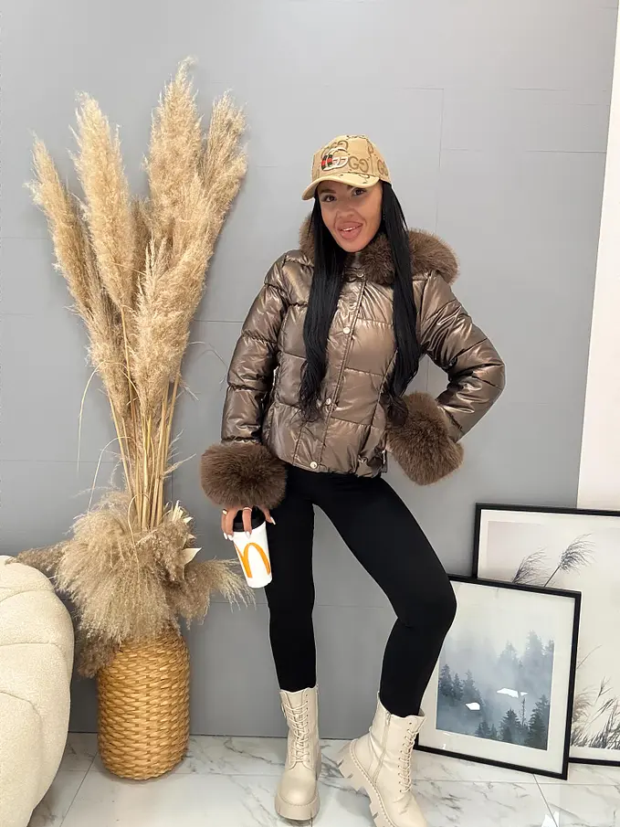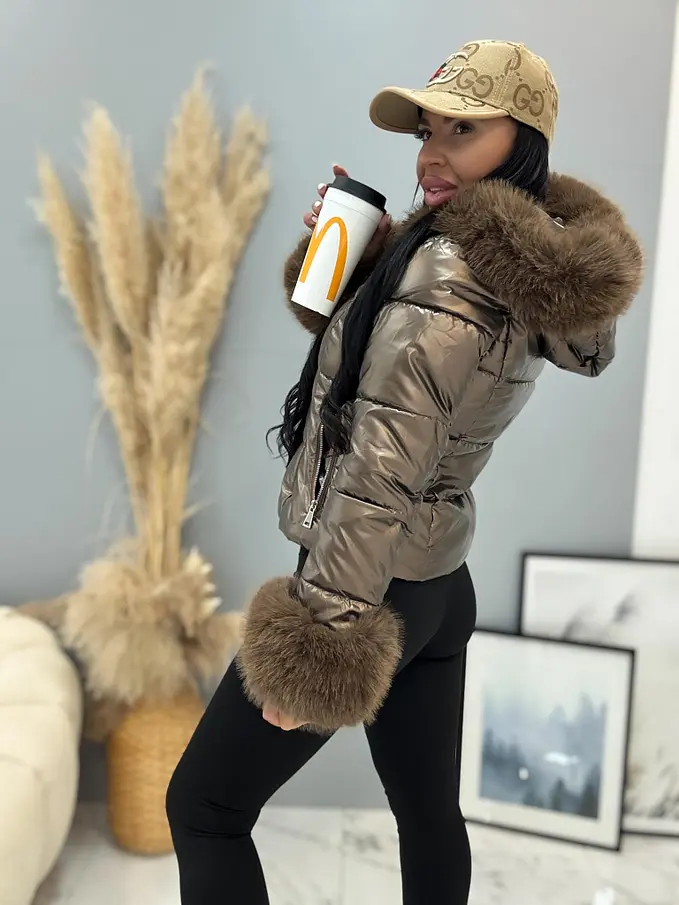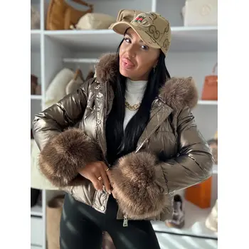 Materiál nie je elastický.Kabát sa zapína na zips a cvoky. Kapucňa je neodnímateľná. S odnímateľným kožušinovým lemom na golieri a rukávoch. Ozdoby sú strieborné.