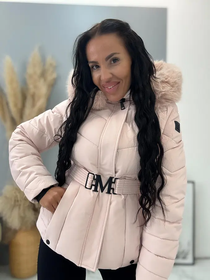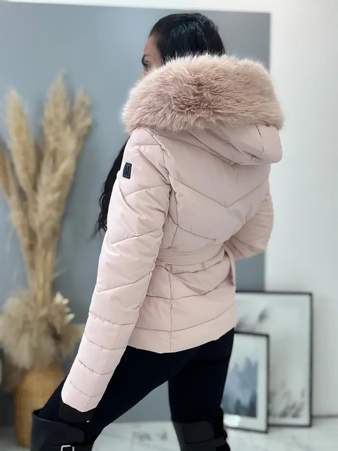 Bunda s odnímateľným kožušinovým lemom na kapucni. S odnimateľnou kapucňou a opskom. Vreckami na prednej strane. Ozdoba v čiernej farbe.