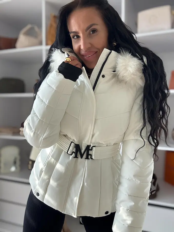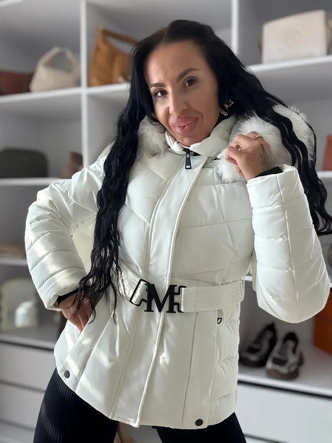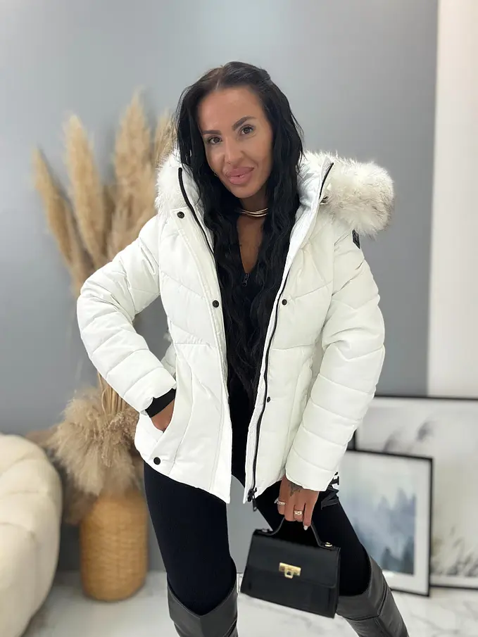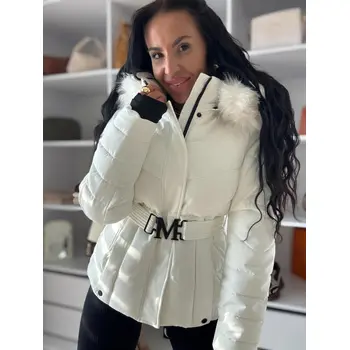 Bunda s odnímateľným kožušinovým lemom na kapucni. S odnimateľnou kapucňou a opskom. Vreckami na prednej strane. Ozdoba v čiernej farbe.