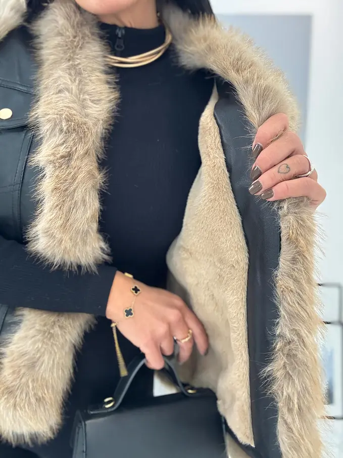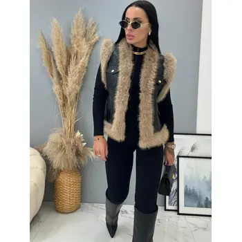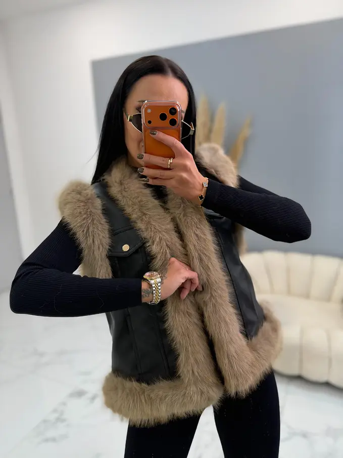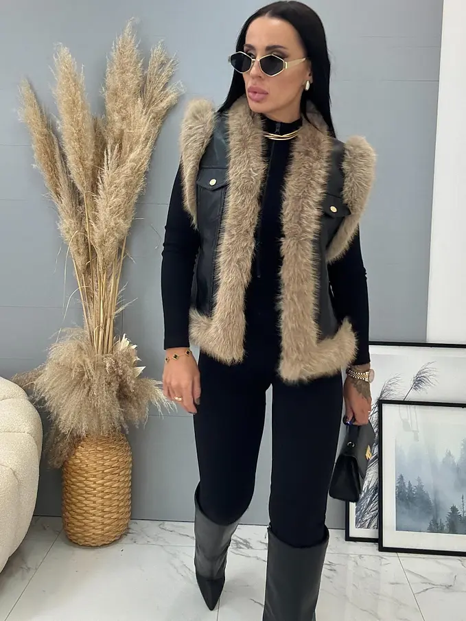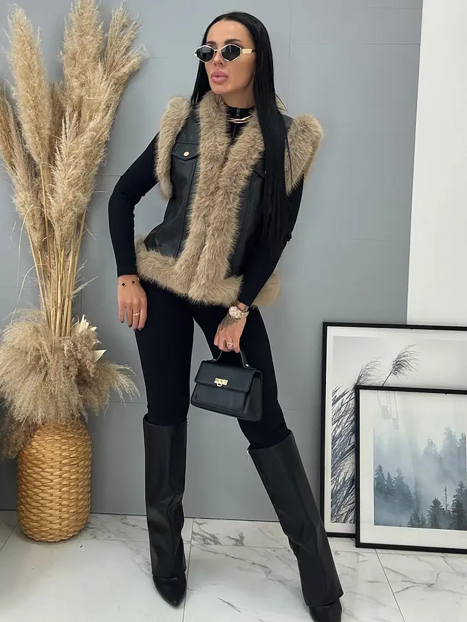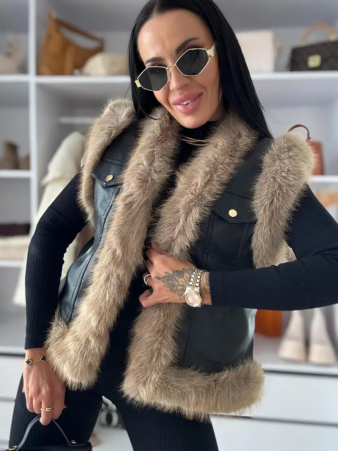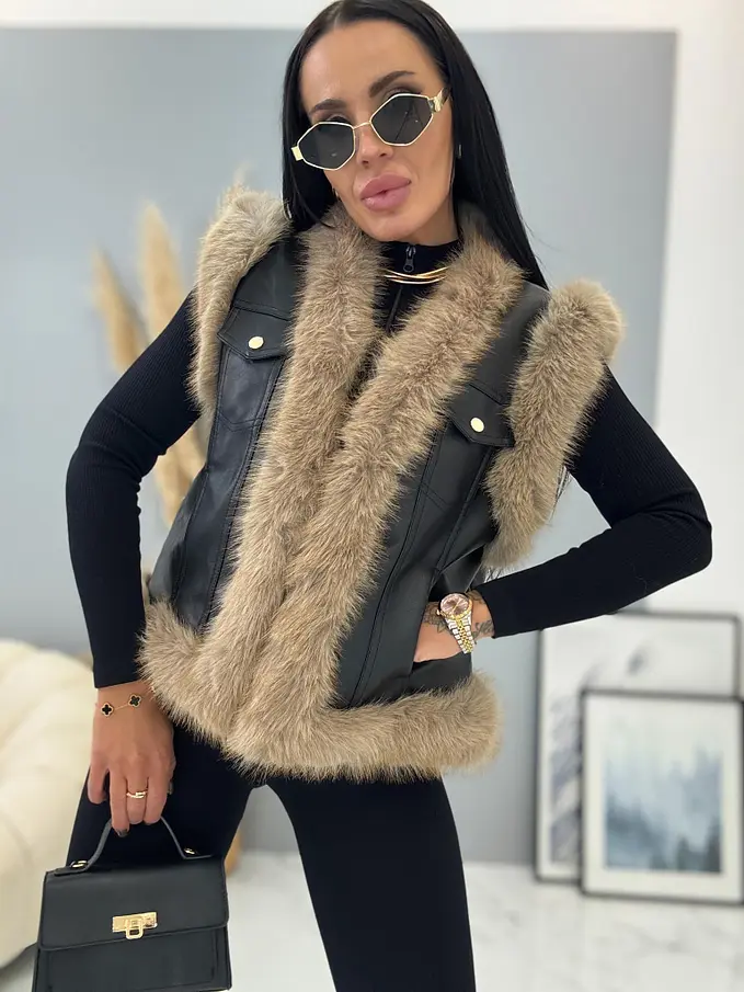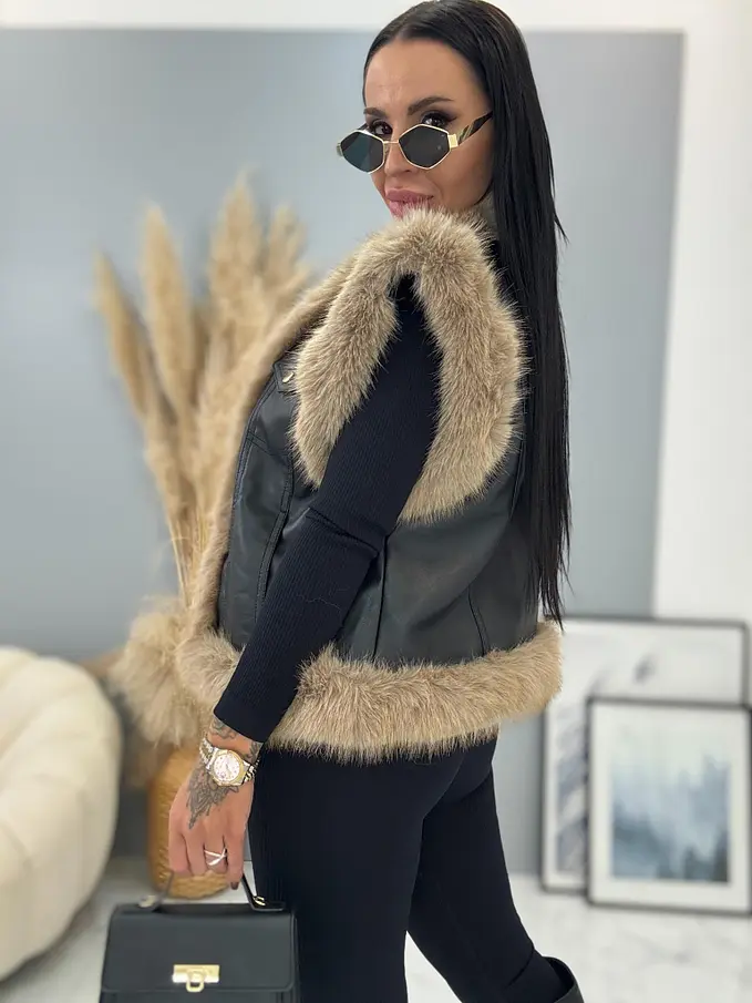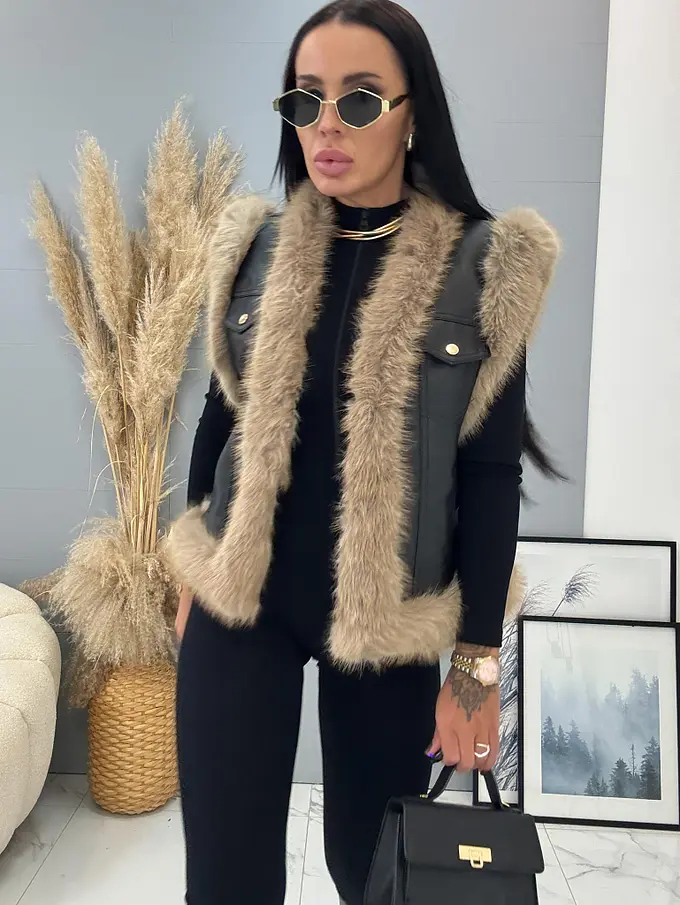 Kožená vesta s kožušinovým lemom. Podšitý mäkkým, príjemným kožúškom. Detaily sú v zlatej farbe. S bočnými vreckami v prednej časti. So sponovým zapínaním.