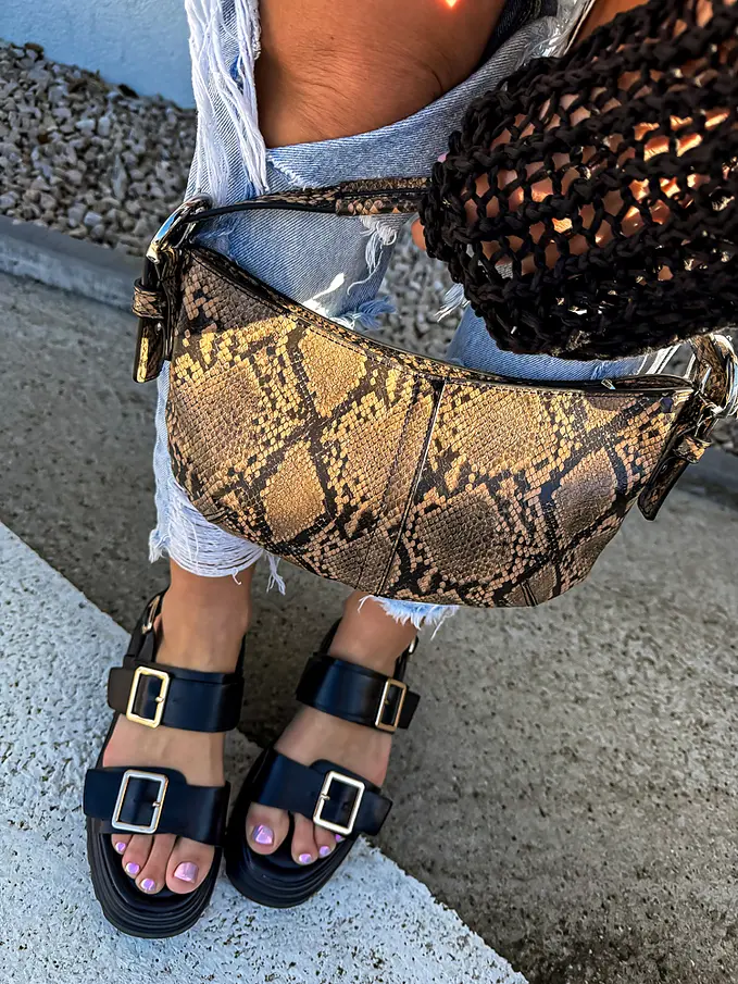 Dámske sandále na každú príležitosť. Doplnky majú zlatú farbu.