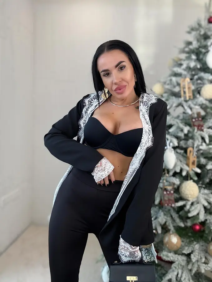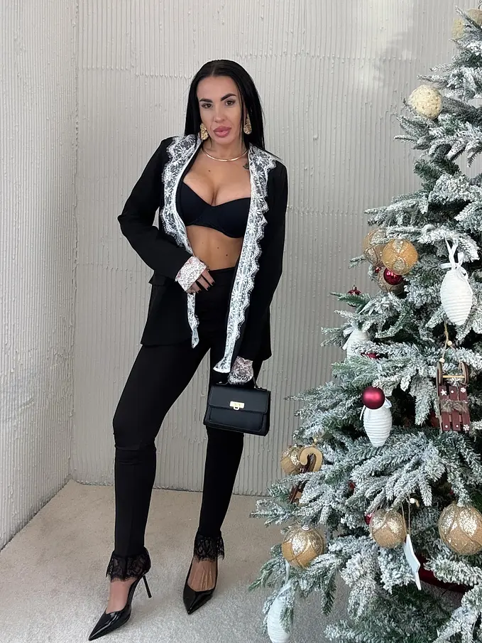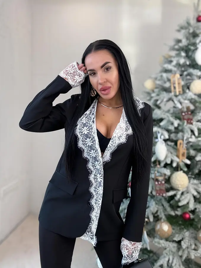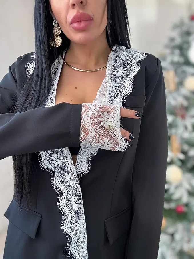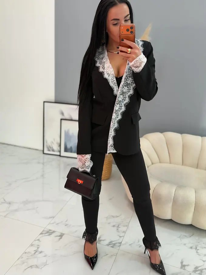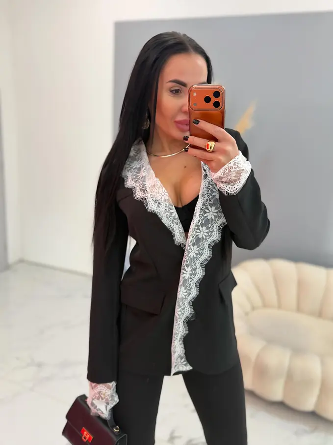 Dámske sako z príjemného materiálu. Materiál nie je elastický. Sako sa zapína na gombíky. Má vypchávky v oblasti ramien. Priehľadnými čipkovými vsadkami.