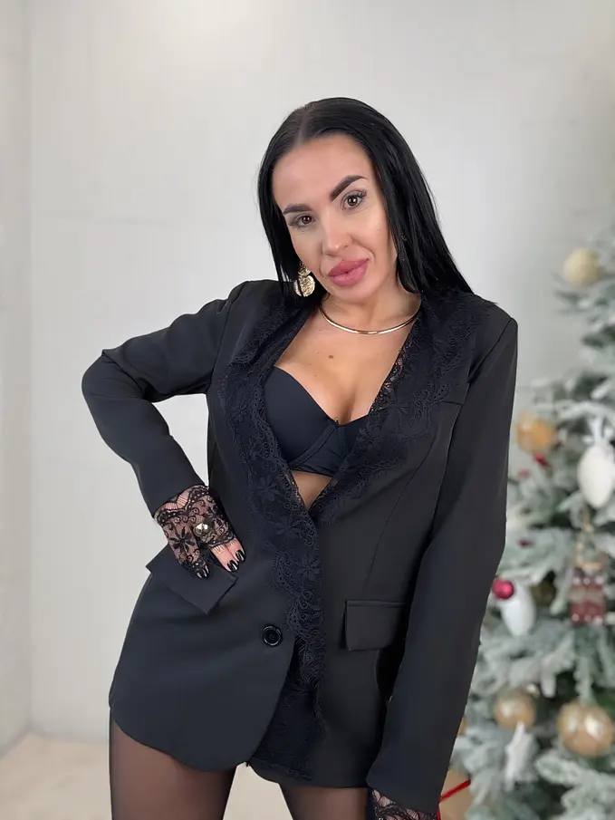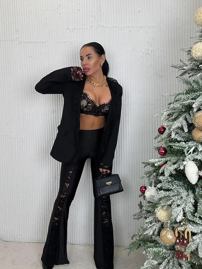Dámske sako z príjemného materiálu. Materiál nie je elastický. Sako sa zapína na gombíky. Má vypchávky v oblasti ramien. Priehľadnými čipkovými vsadkami.