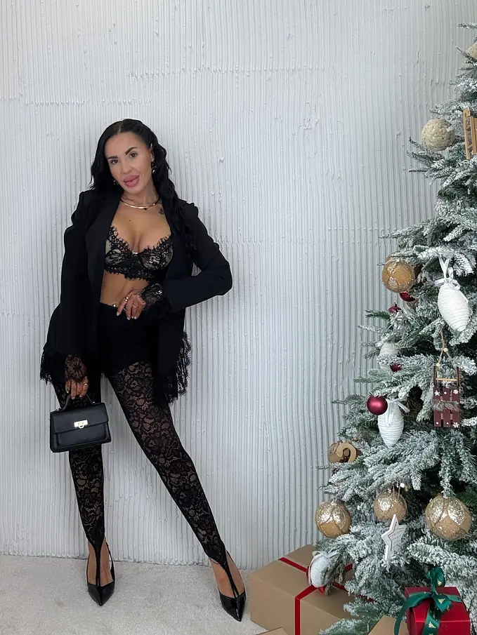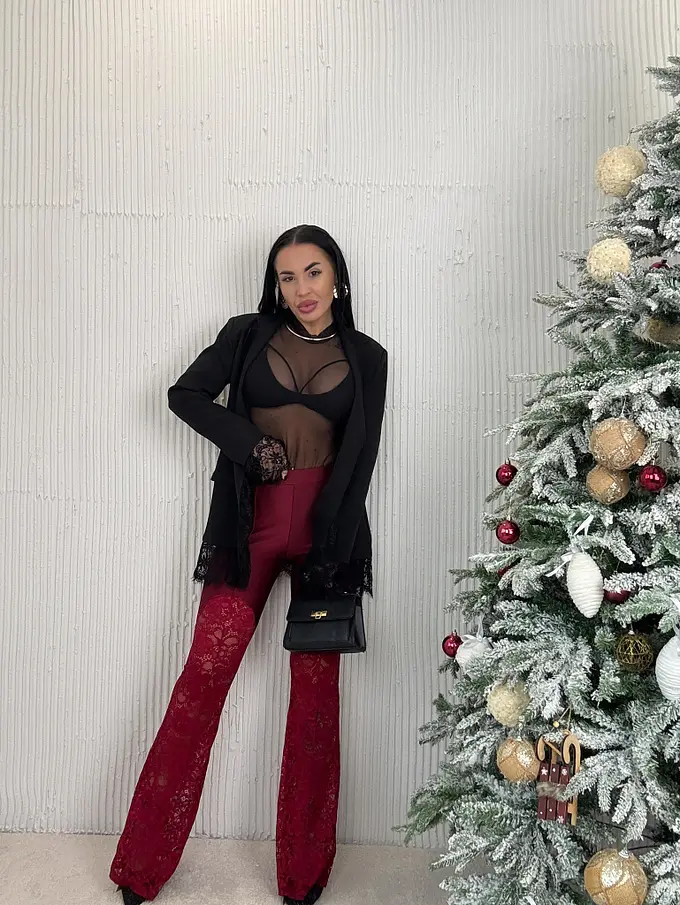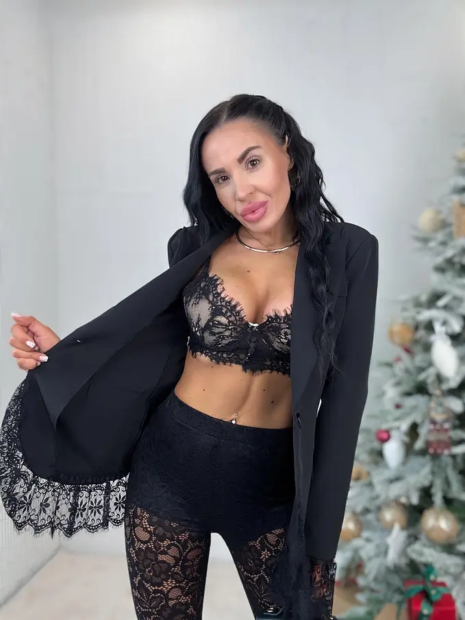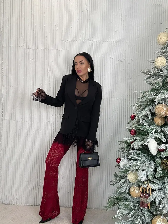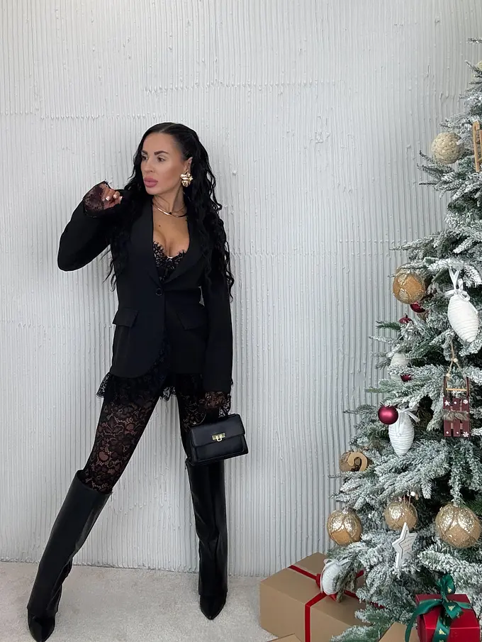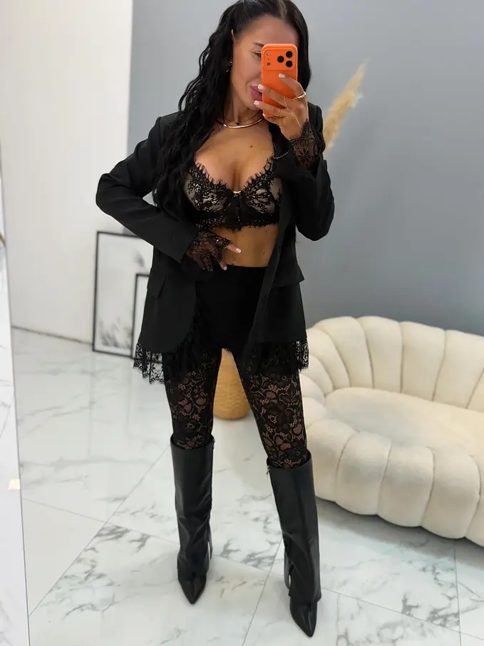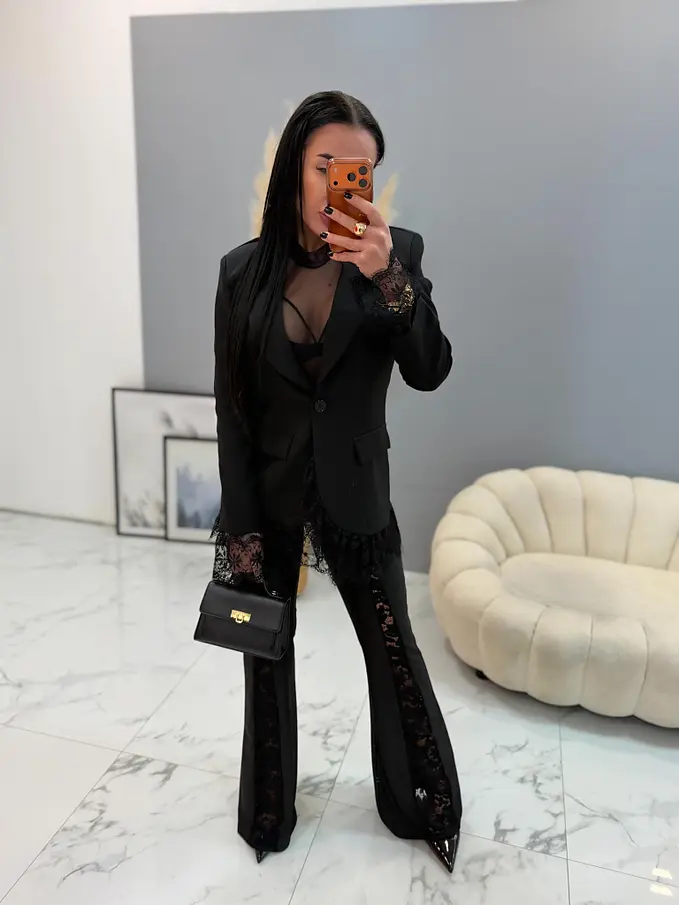 Dámske sako z príjemného materiálu. Materiál nie je elastický. Sako sa zapína na gombík. Má vypchávky v oblasti ramien. Priehľadnými čipkovými vsadkami.