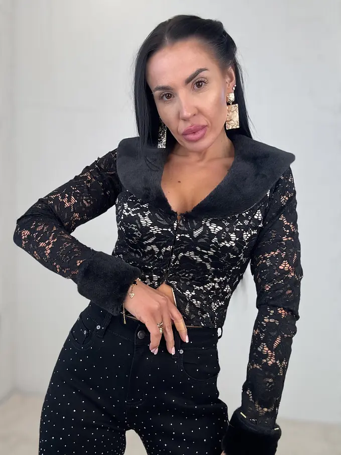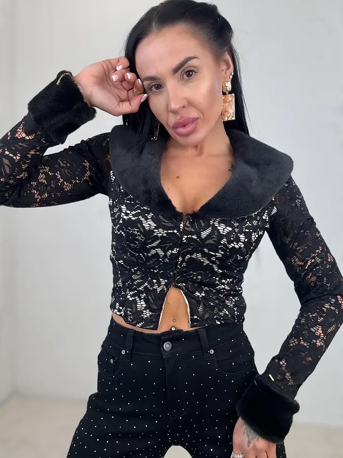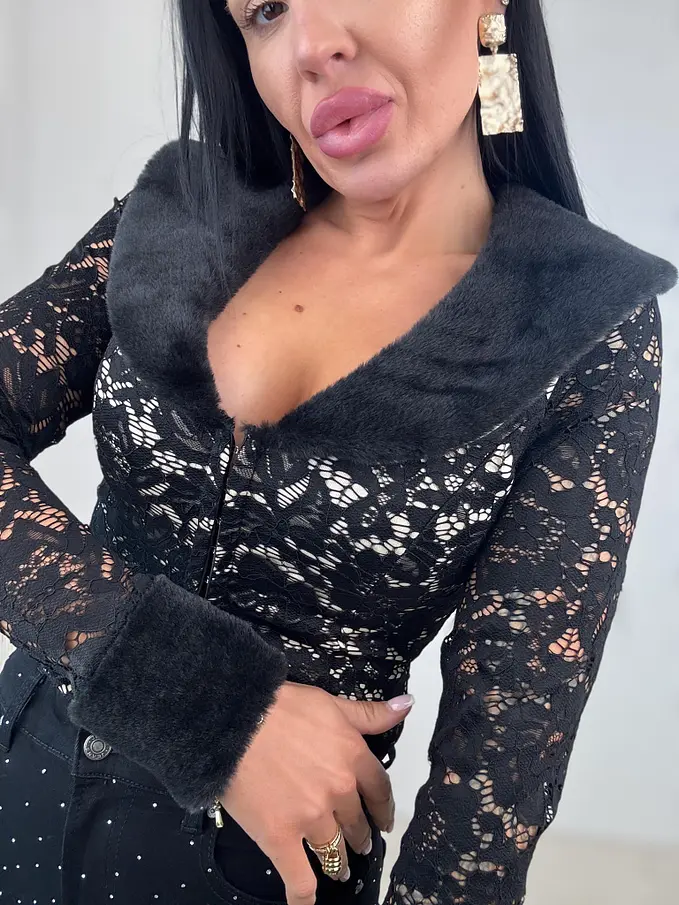 Čipkovaný kardigán z príjemného materiálu. Materiál je elastický. Kardigán sa zapína na spony. Zdobený s kožušinou.
