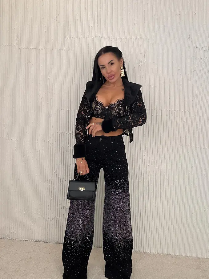 Modelka meria 164 cm a váži 57 kg.