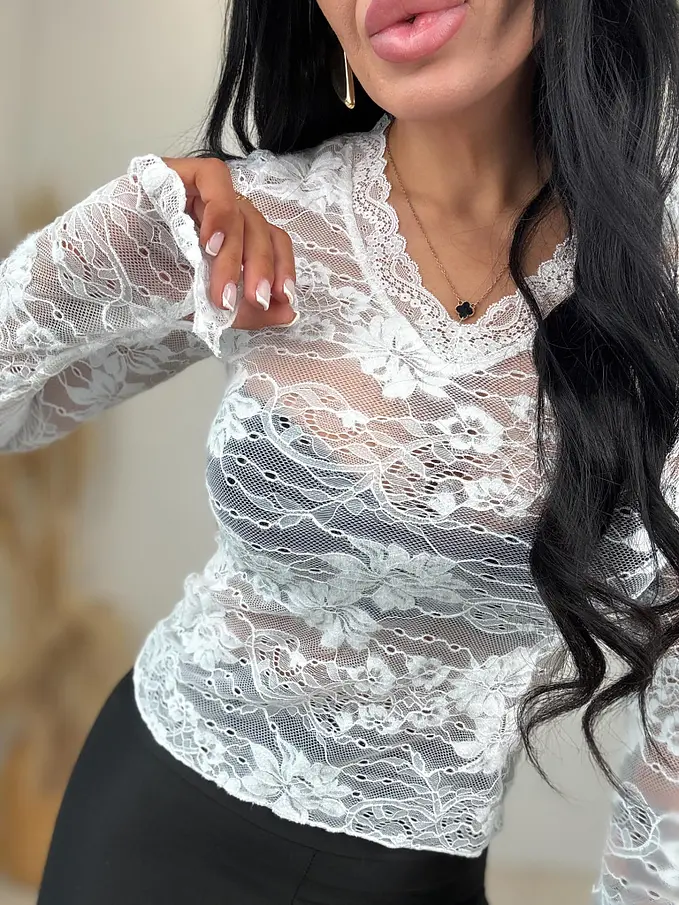 Elegantný čipkovaný top s dlhým rukávom a jemným vzorom.