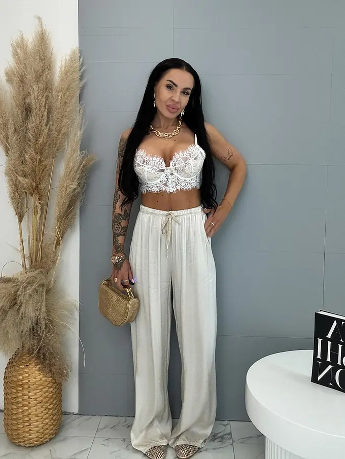 Modelka čiernovláska meria 164 cm a váži 64 kg. Nosí veľkosť M/L. Miery: 99 cm - 74 cm - 93 cm.
