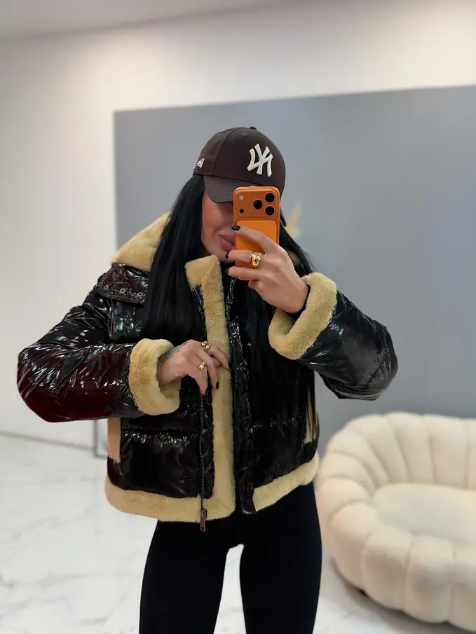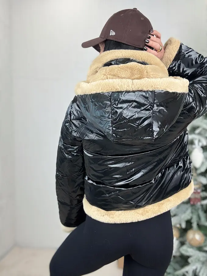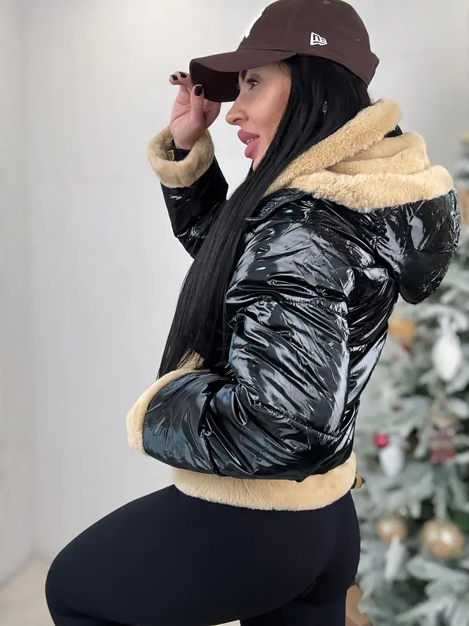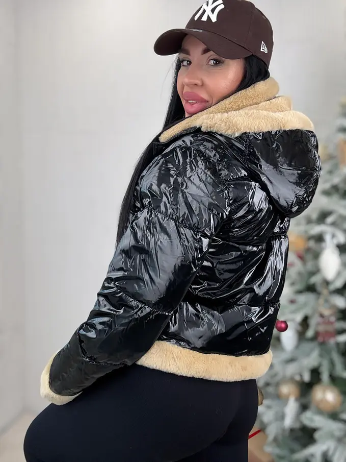 Dámska bunda s neodnímateľným kožušinovým lemom na golieri a rukávoch. Detaily sú v zlatej farbe. S bočnými vreckami. Kapucňa je neodnímateľná.