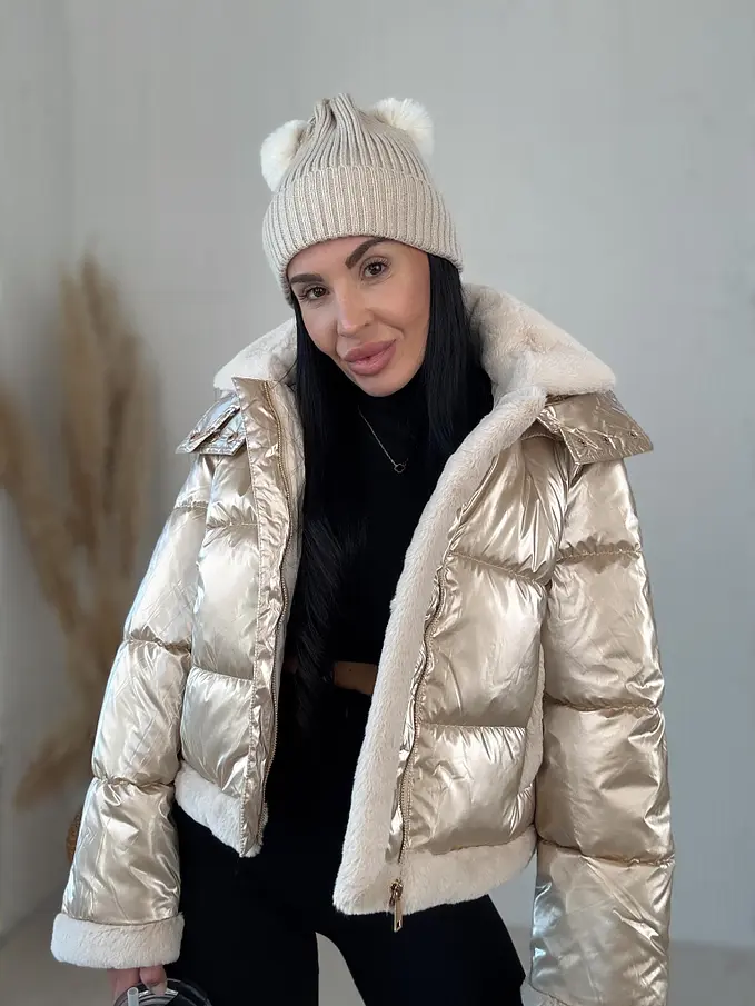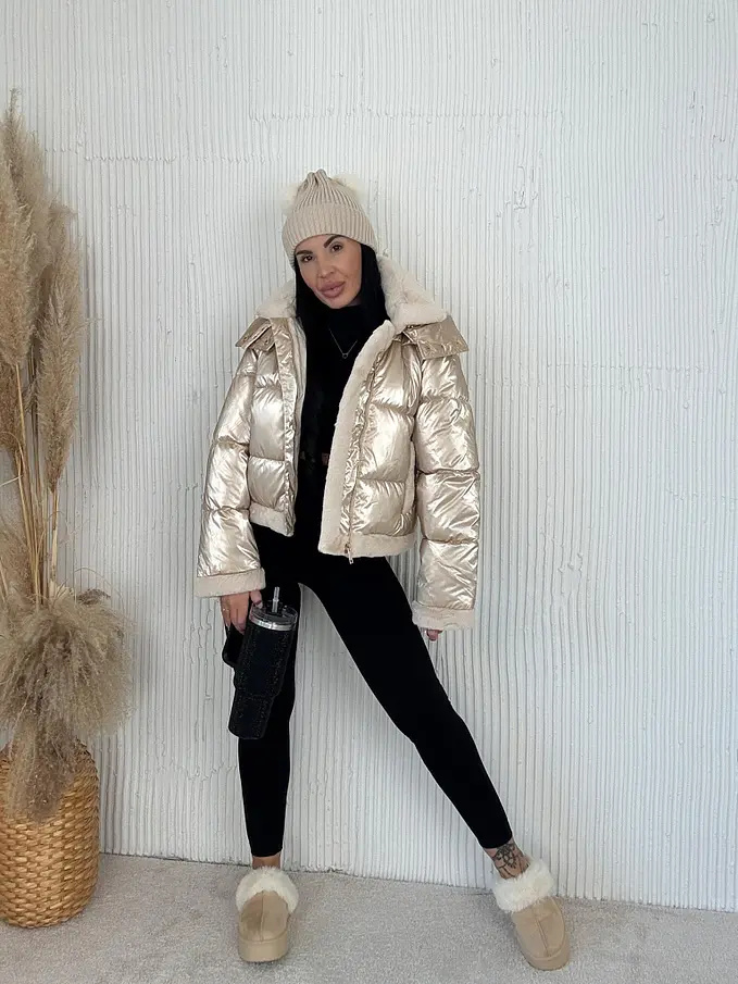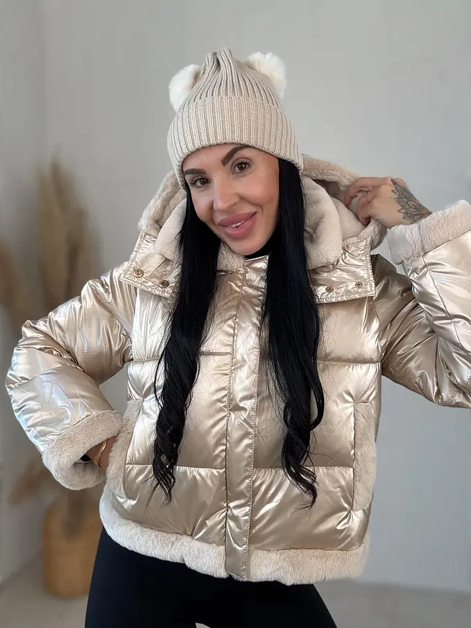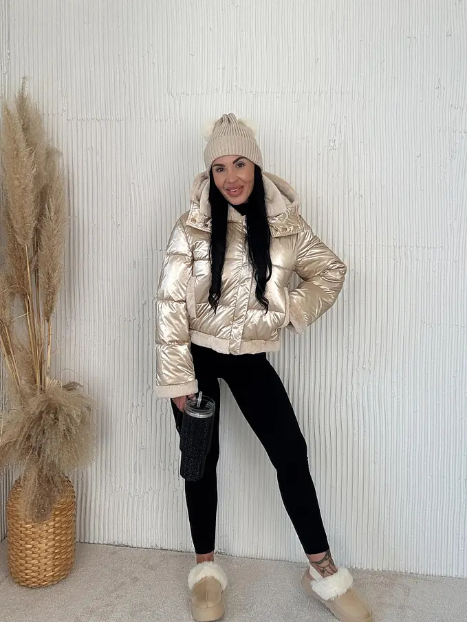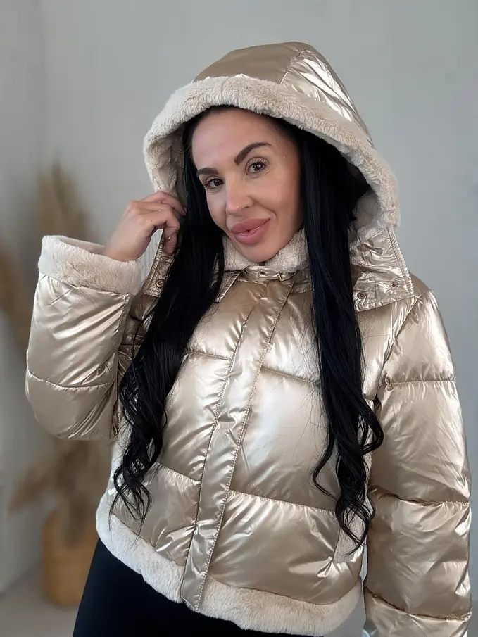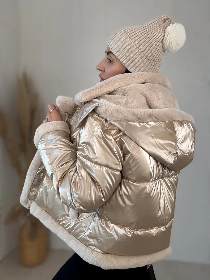 Dámska bunda s neodnímateľným kožušinovým lemom na golieri a rukávoch. Detaily sú v zlatej farbe. S bočnými vreckami. Kapucňa je neodnímateľná.