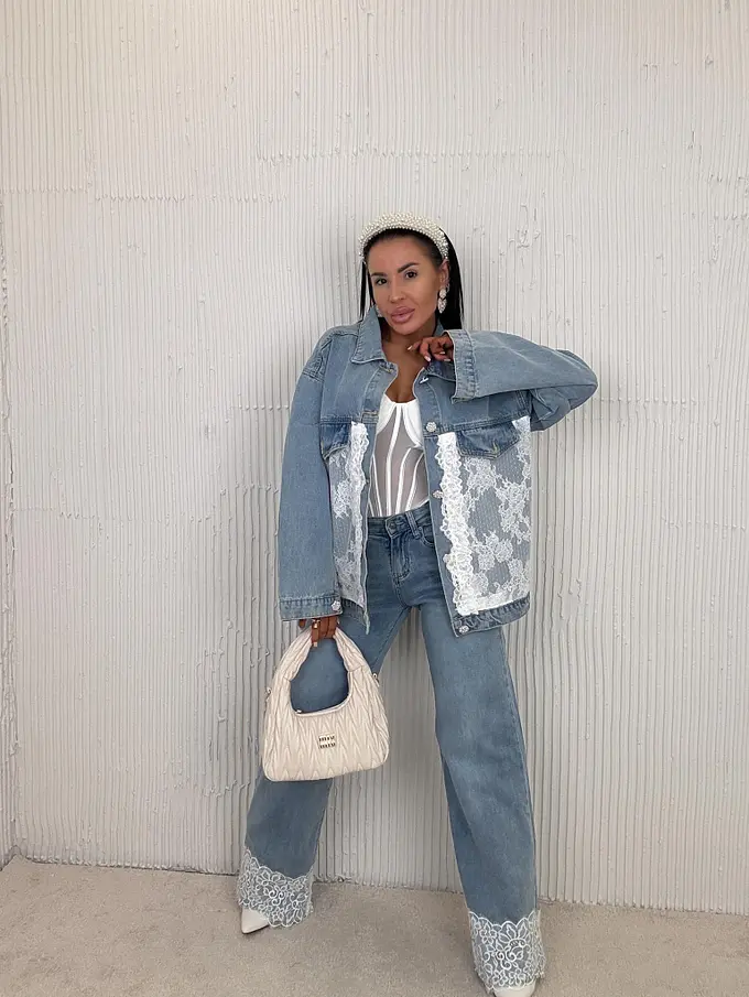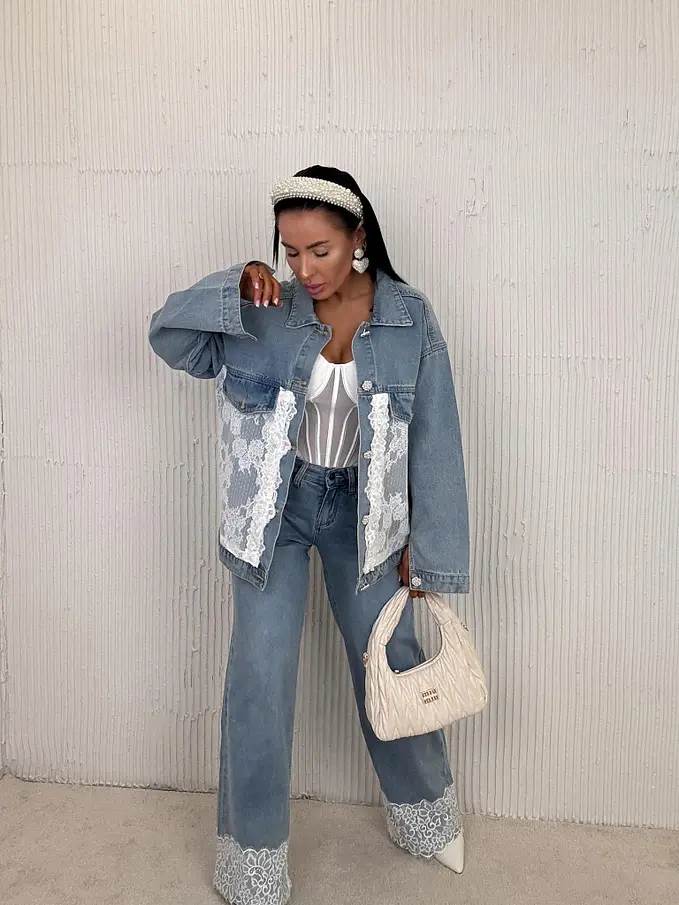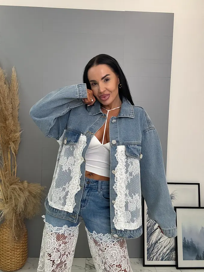 Dámsky denim kabát s ozdobnou čipkou. Materiál je príjemný, a mierne elastický. Strieborné gombíky sú zdobené perlami.