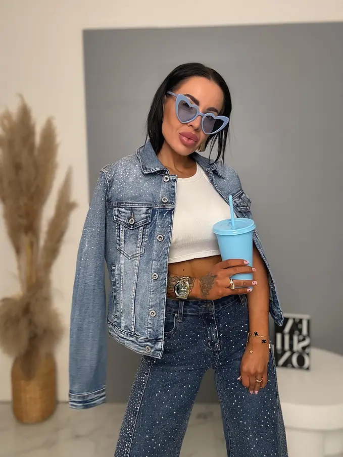 Dámsky denim kabát s ozdobnými kamienkami. Materiál je príjemný, a mierne elastický. Gombíky majú striebornú farbu.