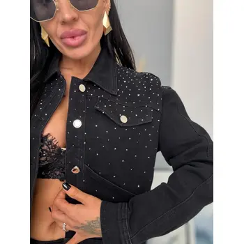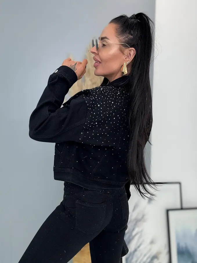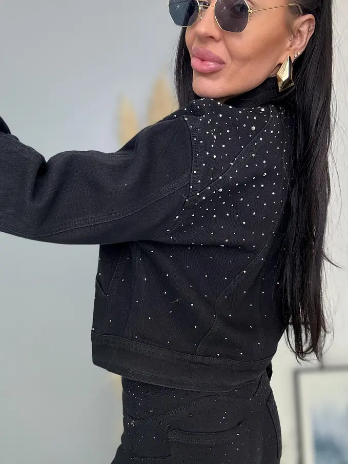 Dámsky denim kabát s ozdobnými kamienkami. Materiál je príjemný, a mierne elastický. Gombíky majú striebornú farbu.