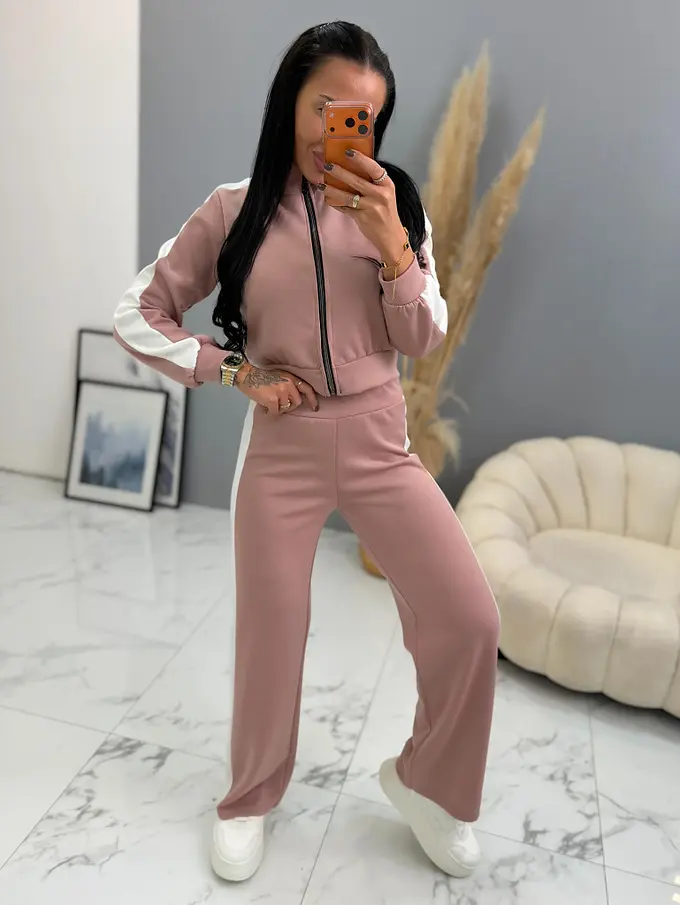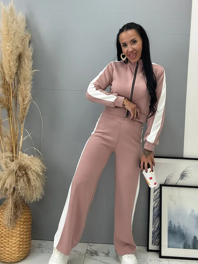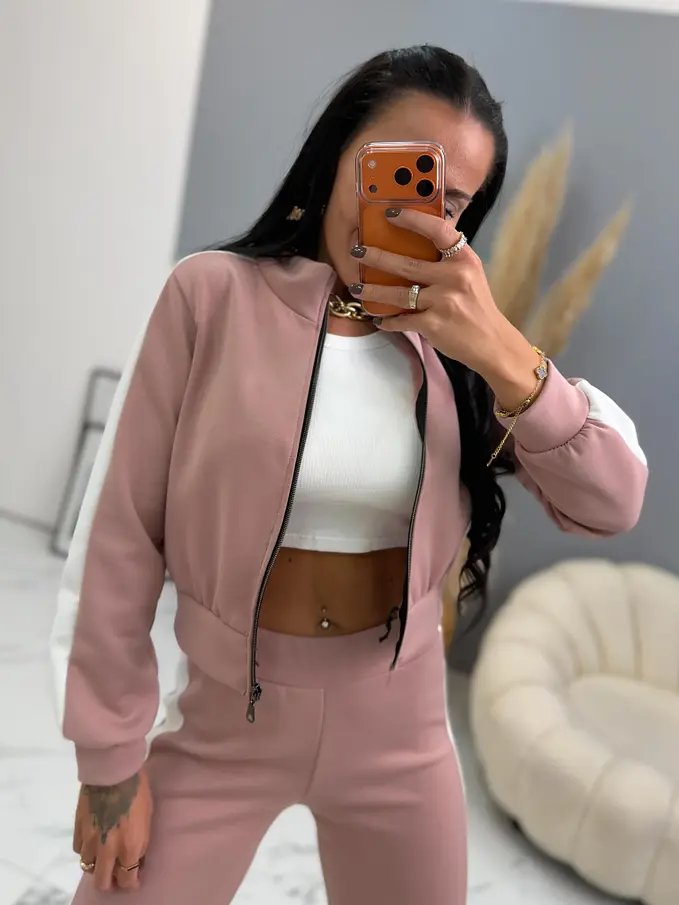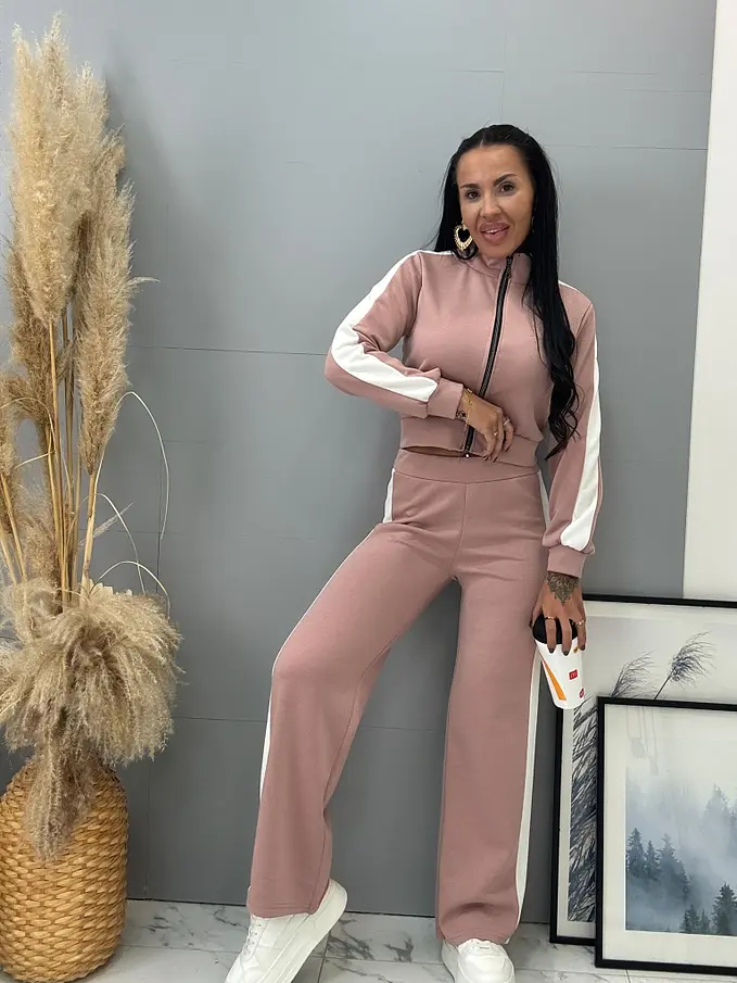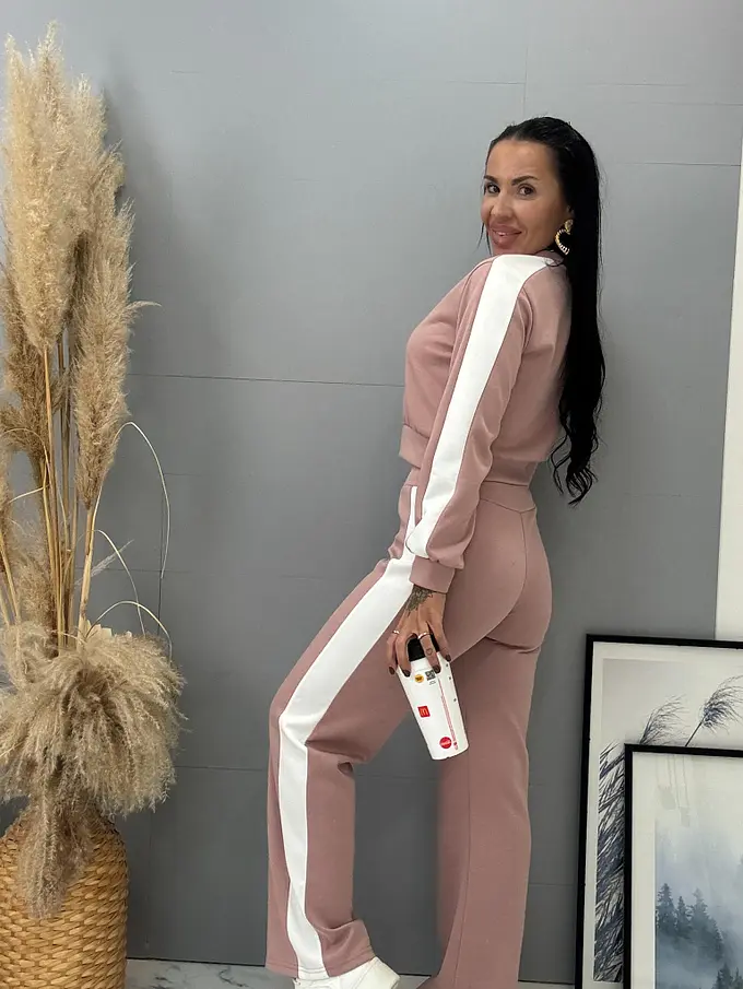 Dámsky komplet z novej kolekcie. Pozostáva z mikiny a nohavíc. Nohavice majú gumený pás. Materiál je príjemný, elastický.