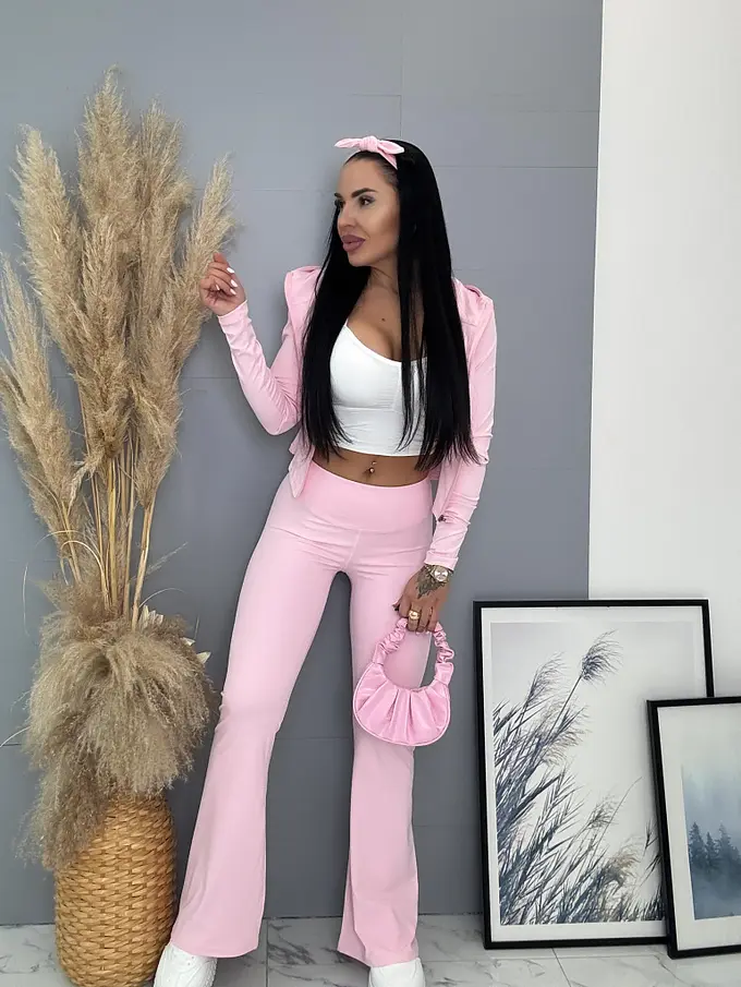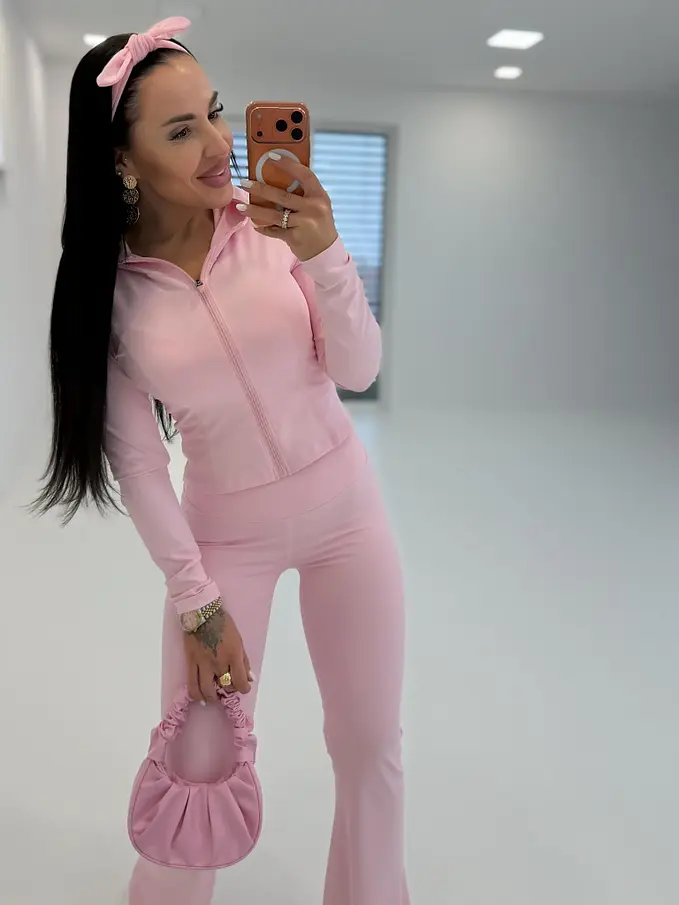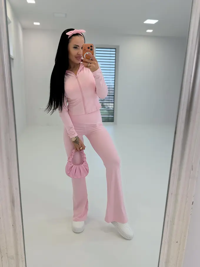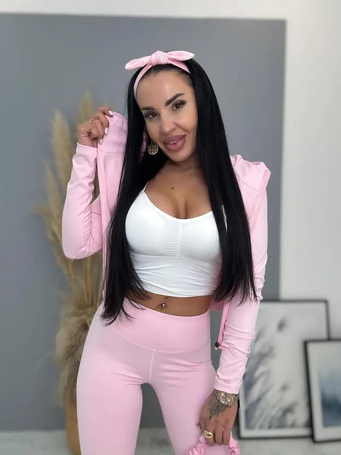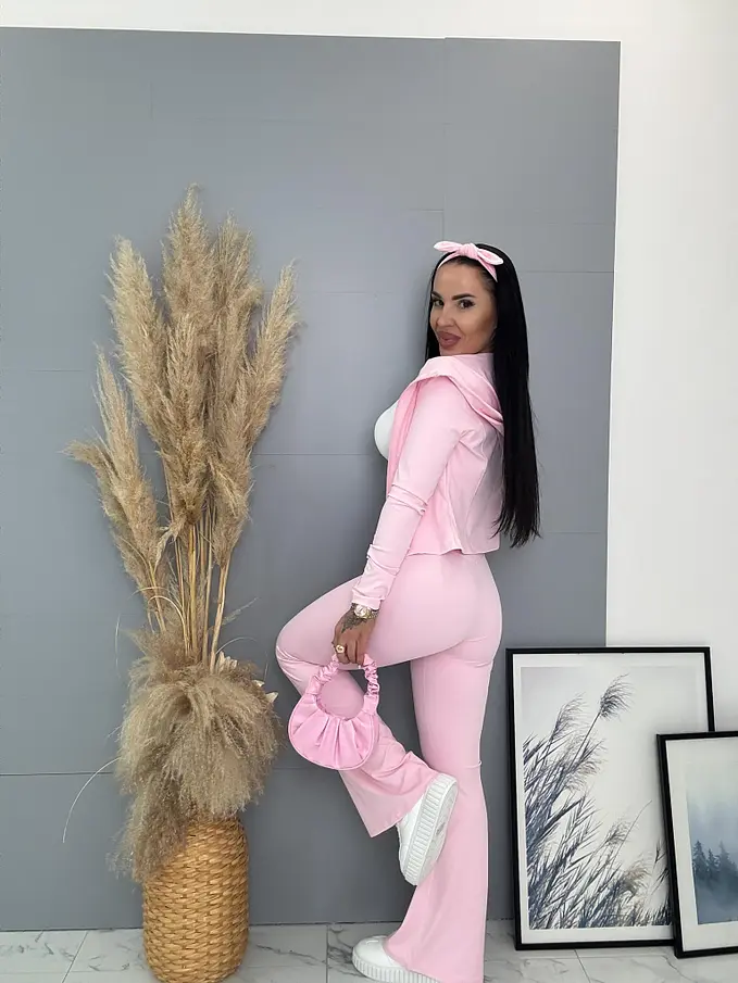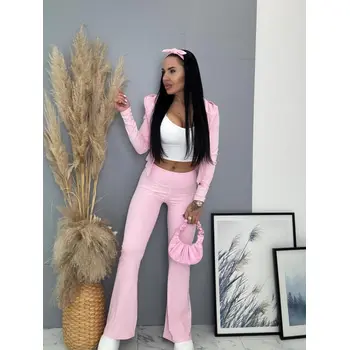 Dámsky komplet z novej kolekcie. Pozostáva z mikiny a nohavíc. Nohavice majú gumený pás. Materiál je príjemný, elastický.