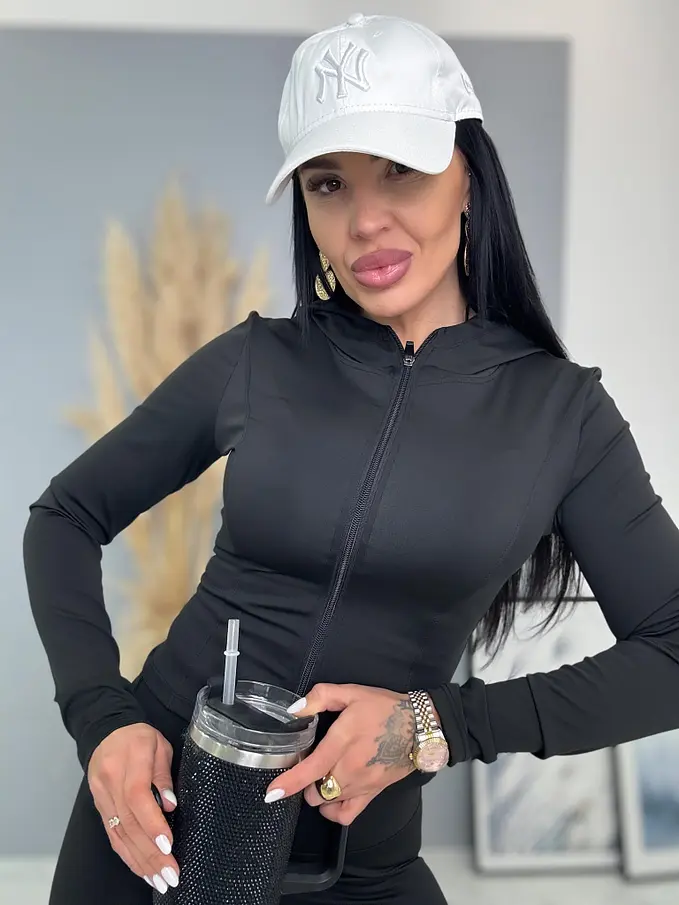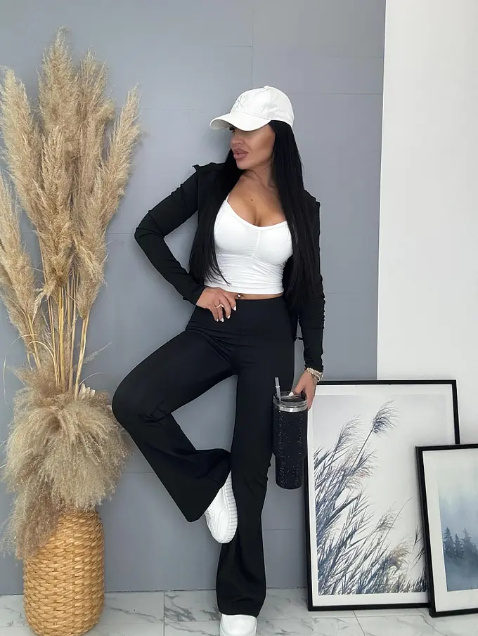 Dámsky komplet z novej kolekcie. Pozostáva z mikiny a nohavíc. Nohavice majú gumený pás. Materiál je príjemný, elastický.