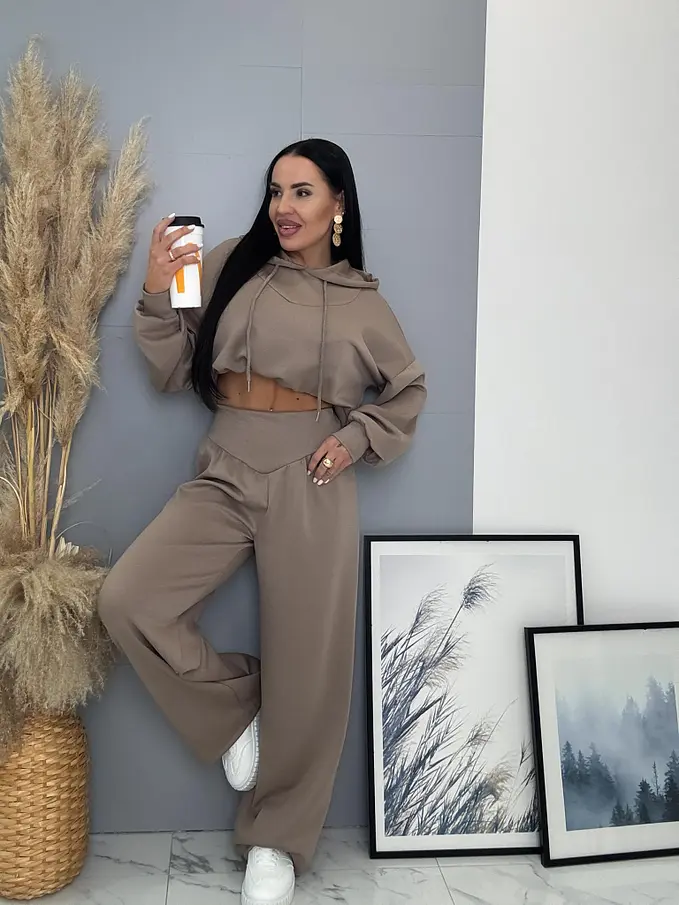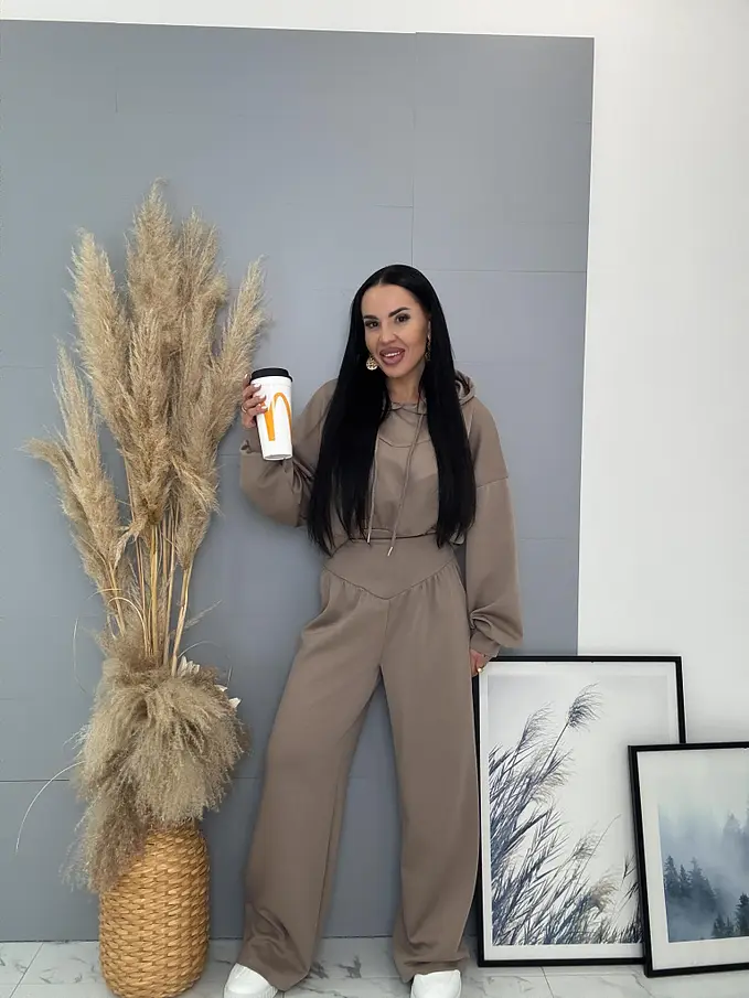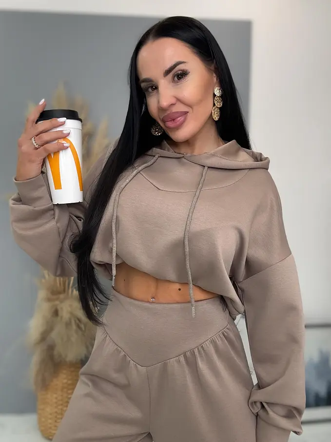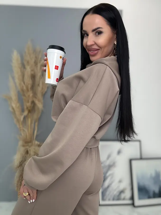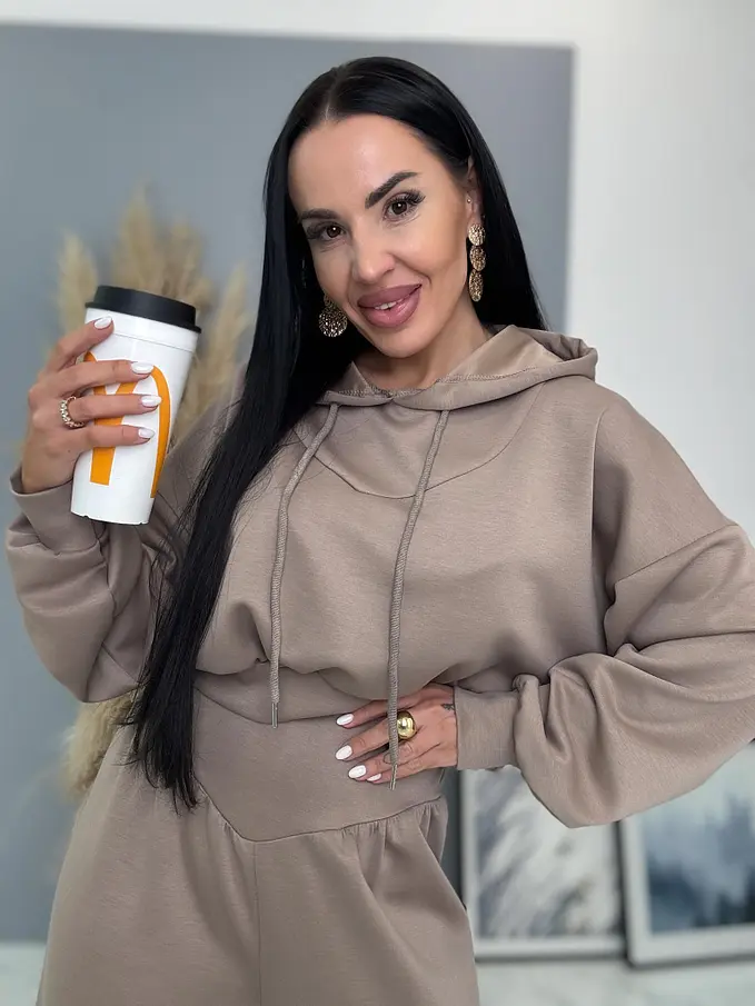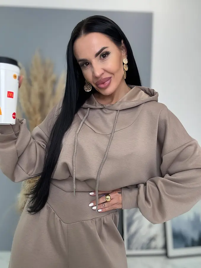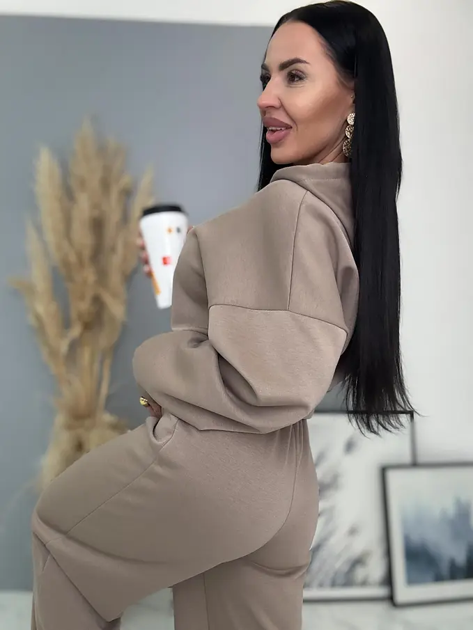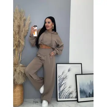 Dámsky komplet z novej kolekcie. Pozostáva z mikiny a nohavíc. Nohavice majú gumený pás. Materiál je príjemný, elastický.