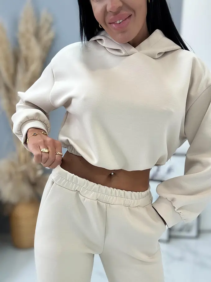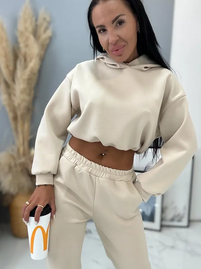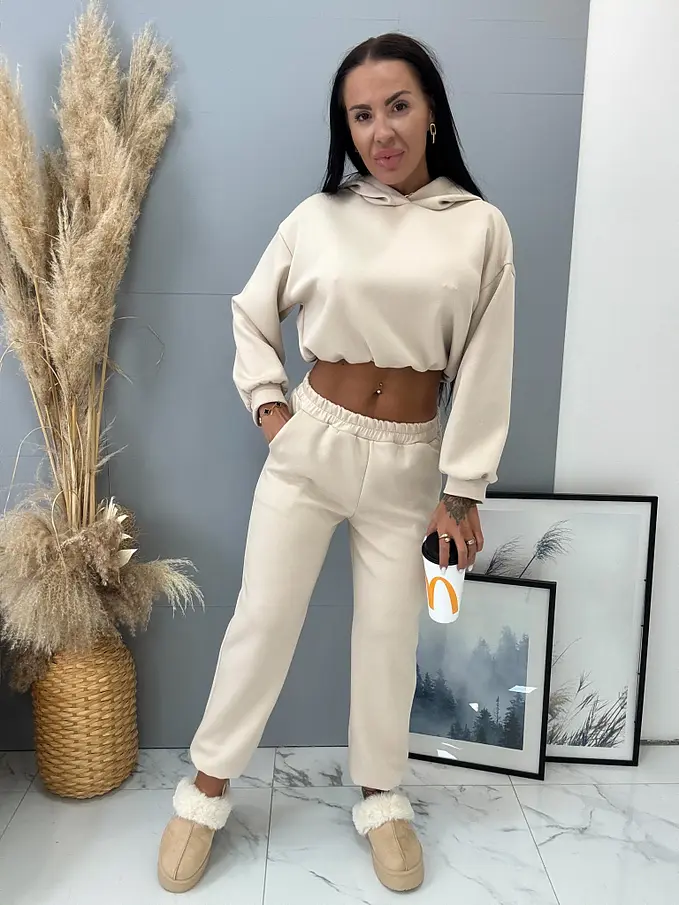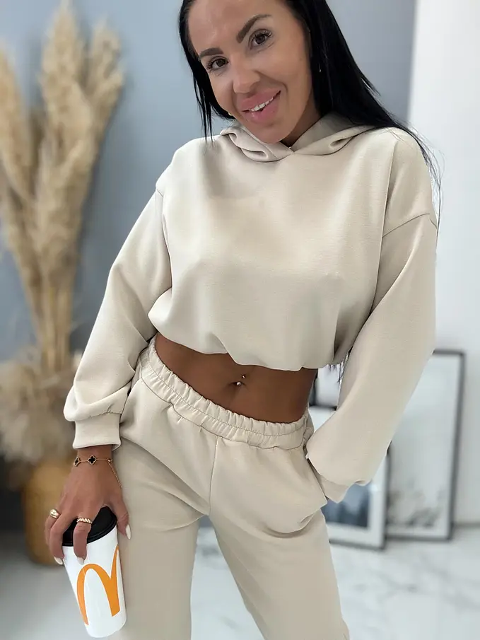 Dámsky komplet z novej kolekcie. Pozozstáva sa z mikini a nohavíc. Nohavice majú gumený pás. Materiál je príjemný, elastický.