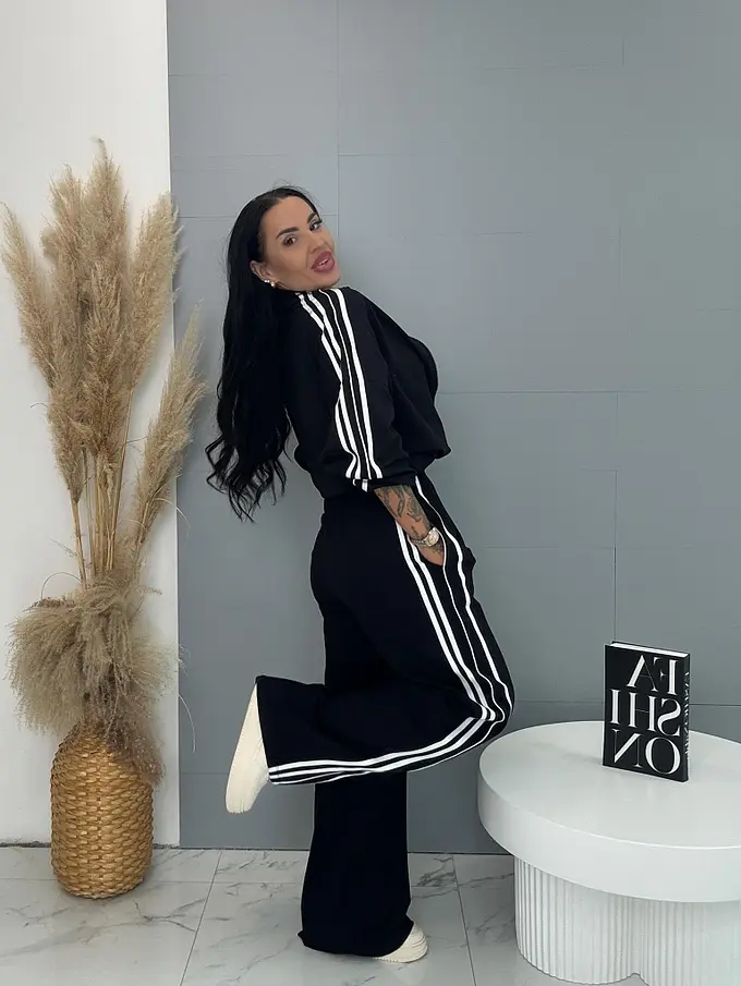 Dámsky komplet z novej kolekcie. Pozostáva z mikiny a nohavíc. Nohavice majú gumený pás a bočné vrecká. Materiál je príjemný, elastický. Mikina so zipsom a má stiahnutý spodný lem.
