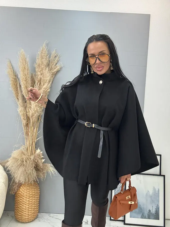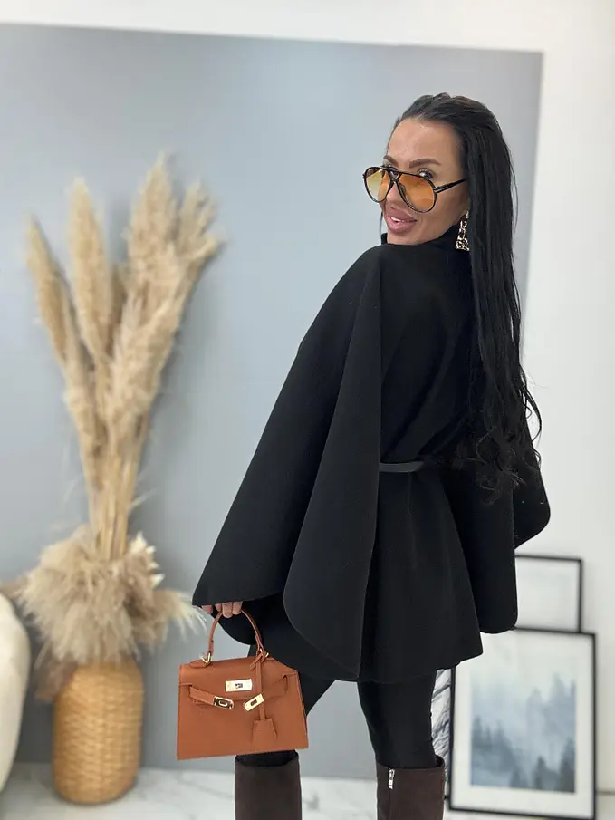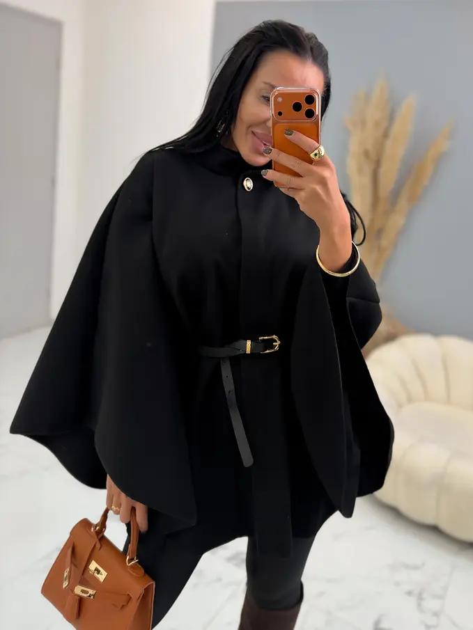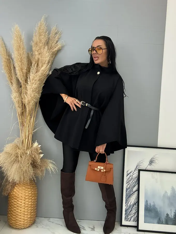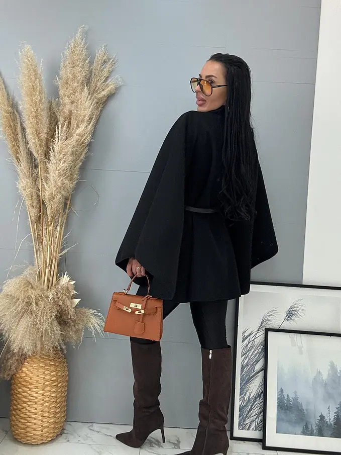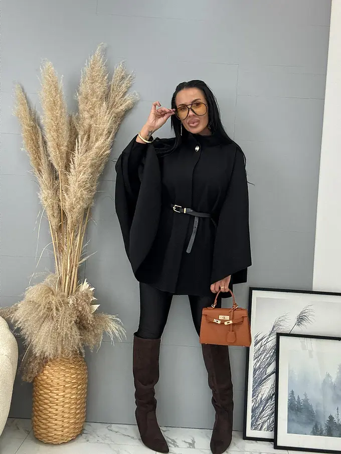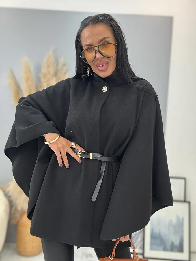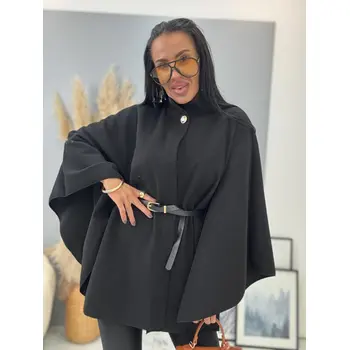 Premium kvalita. Dámske asymetrické pončo doplnené moderným opaskom v čiernej farbe. Pončo je asymetrického strihu, vďaka ktorému pôsobí luxusne. Materiál nie je elastický. Kabát sa zapína na jeden zlatý gombík.