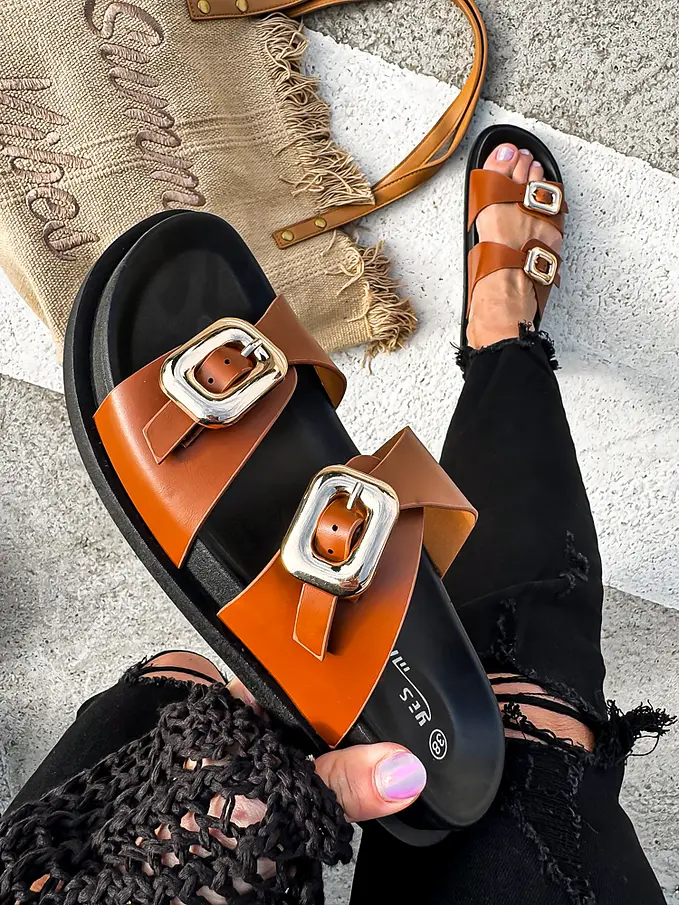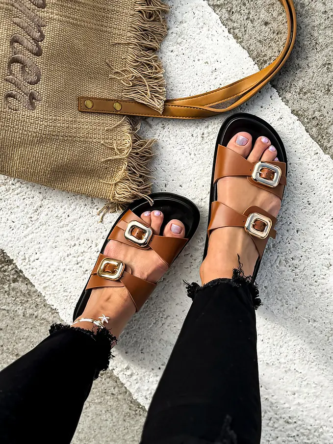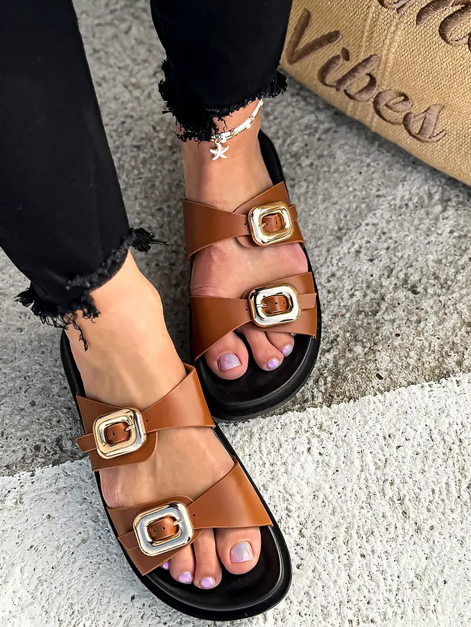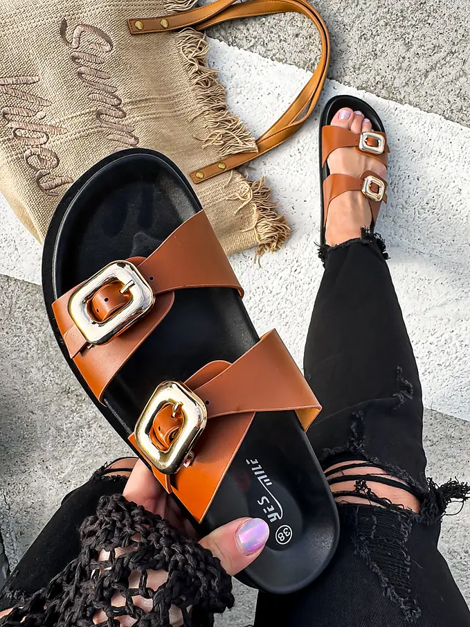 Dámske šľapky na každú príležitosť. Doplnky majú zlatú farbu.