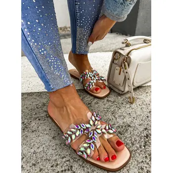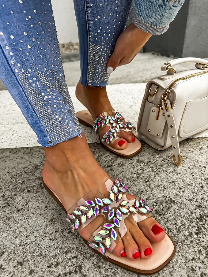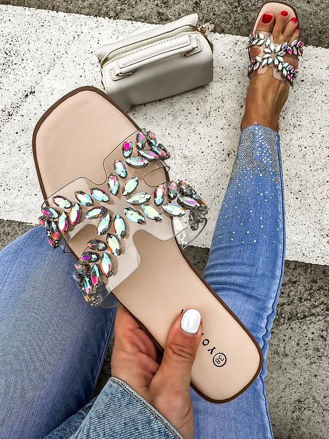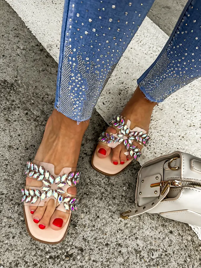 Dámske šľapky zdobené kamienkami.