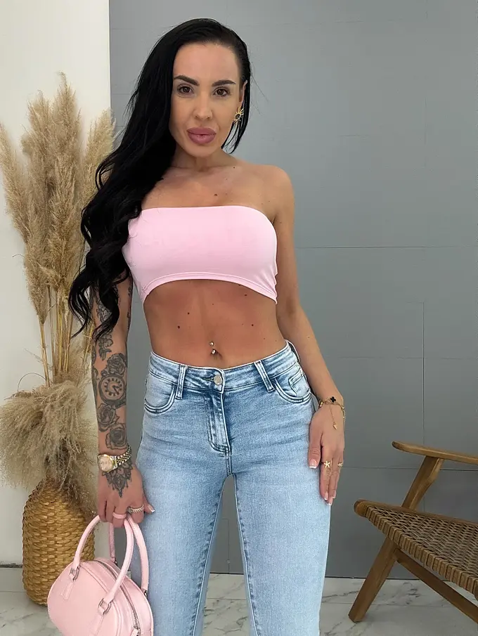 Modelka meria 164 cm a váži 57 kg. Má na sebe veľkosť S