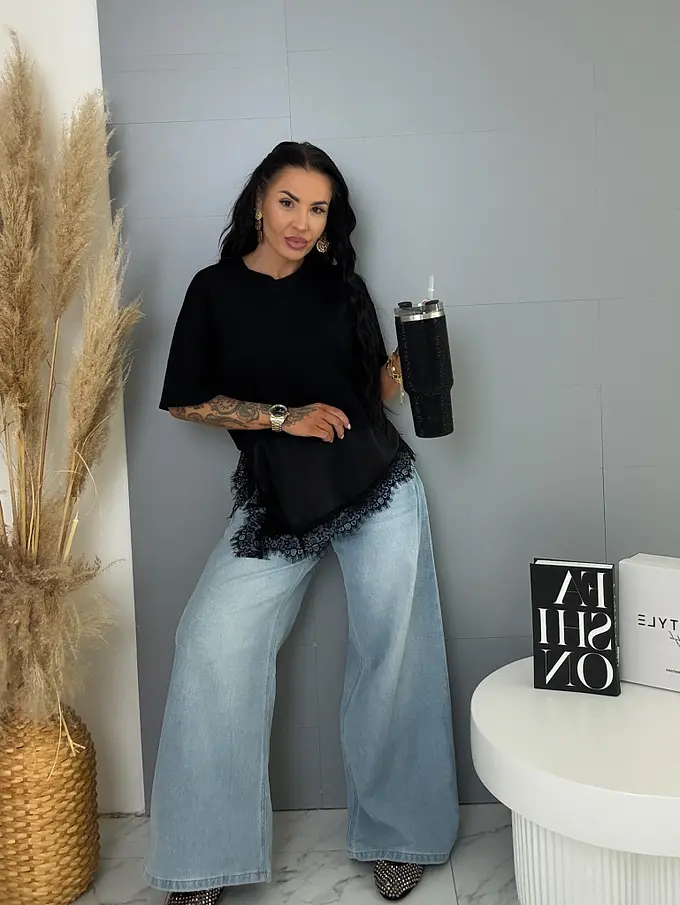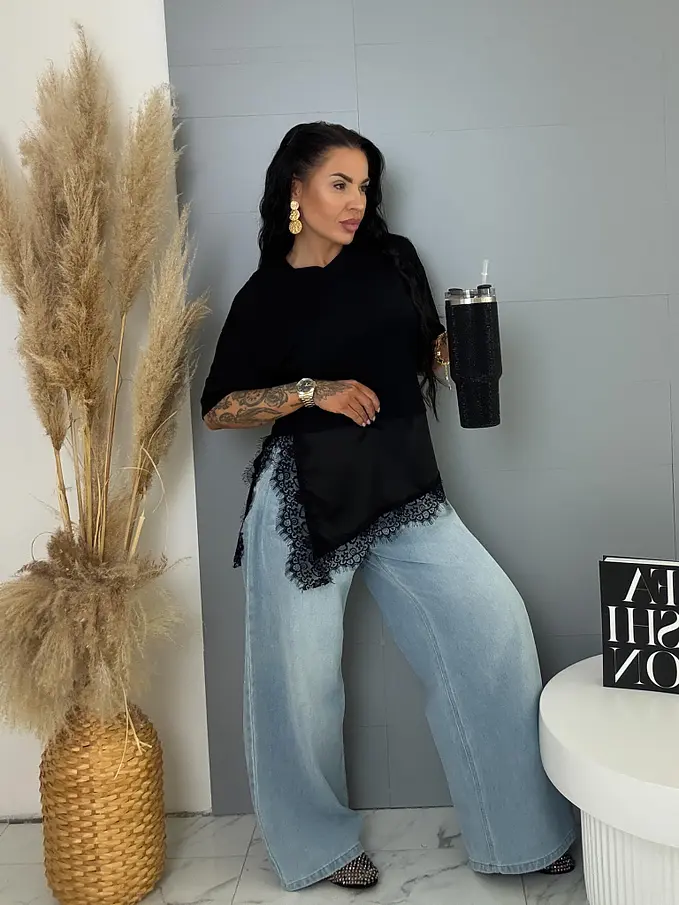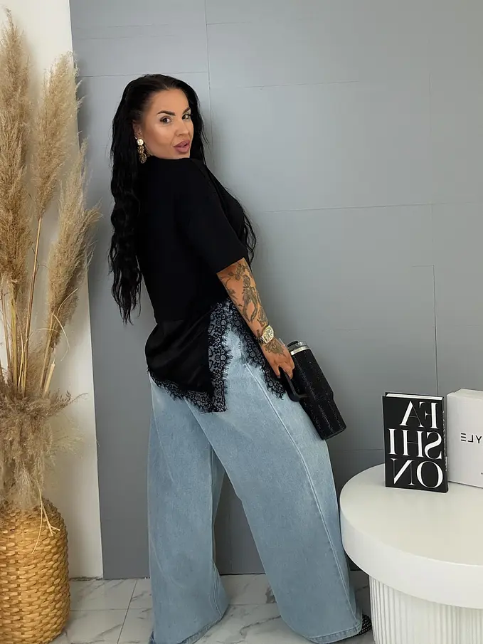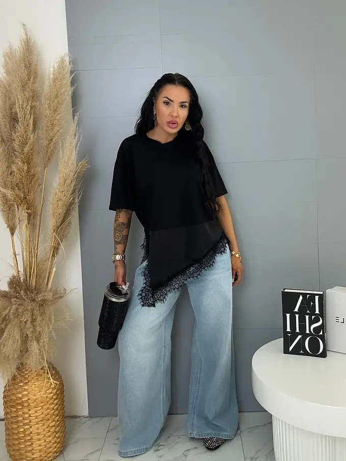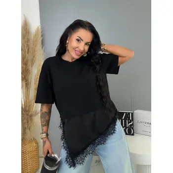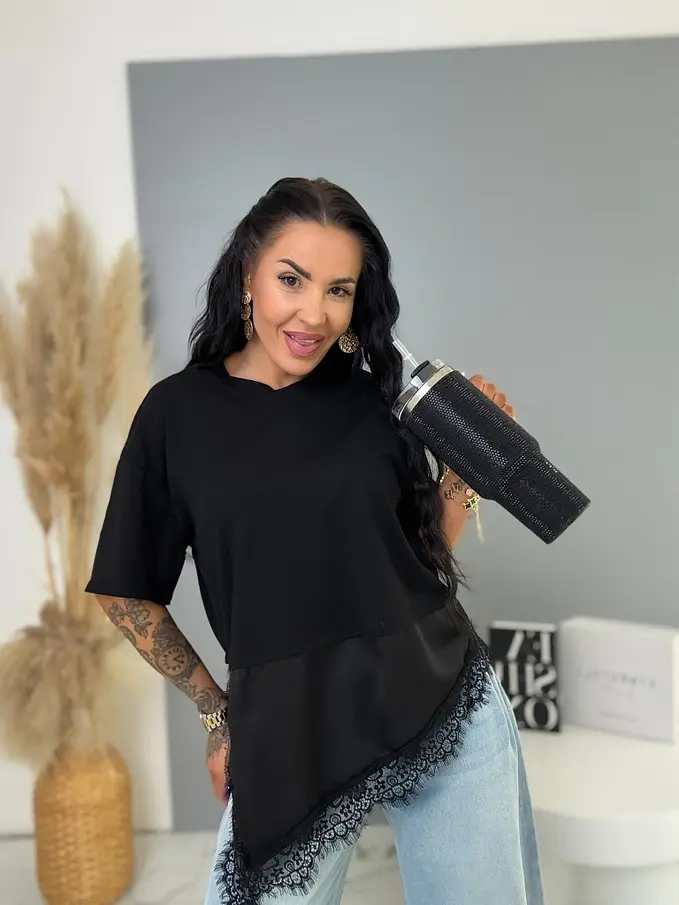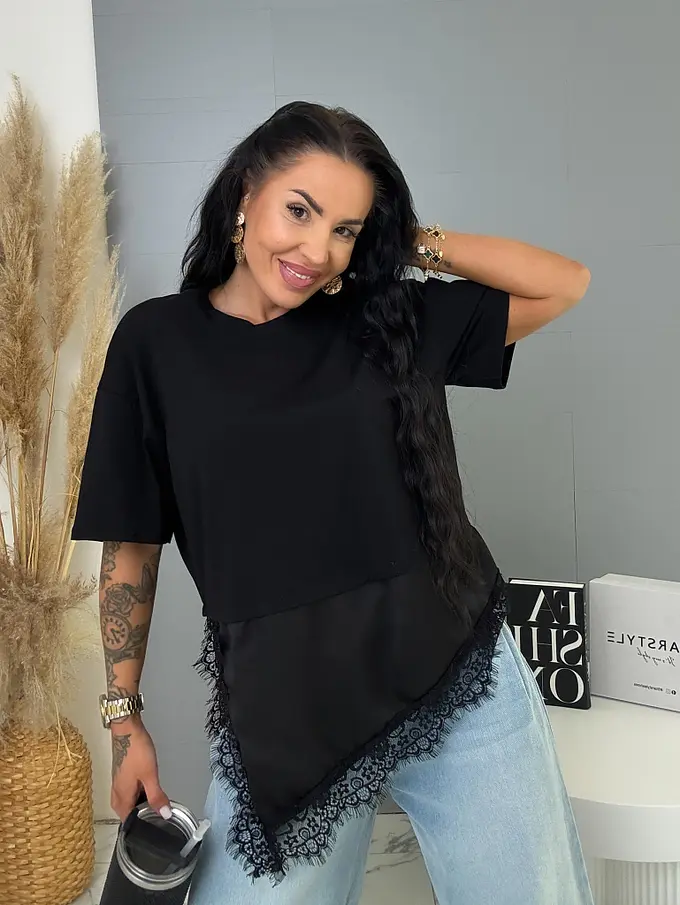 Prémiová kvalita. Tričko je vyrobené z príjemného elastického materiálu vo voľnom asymetrickom strihu. Na spodnom leme je krajkové zdobenie.