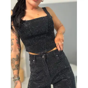 Denim crop-top s kamienkami DIAMOND BLACK