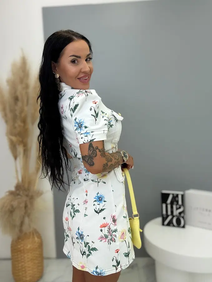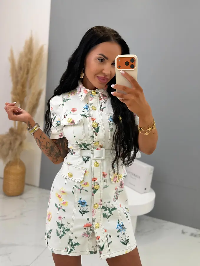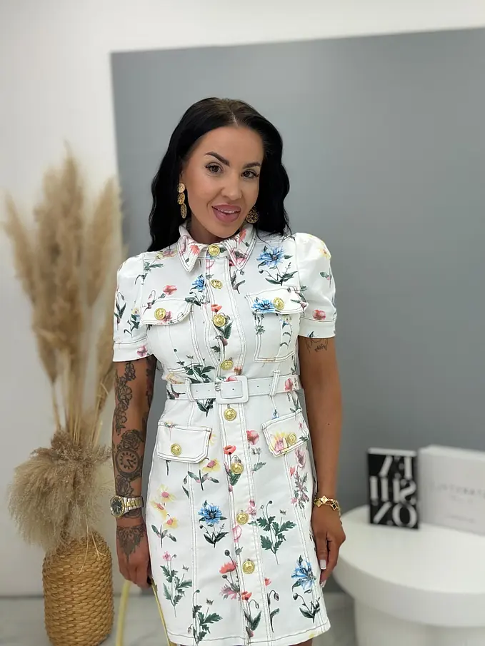 Prémiové šaty priamo z Francúzska. Kvetované rifľové šaty so zlatými gombíkmi a opaskom. Materiál je mierne elastický.