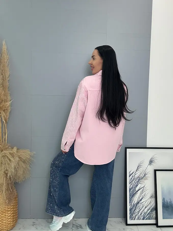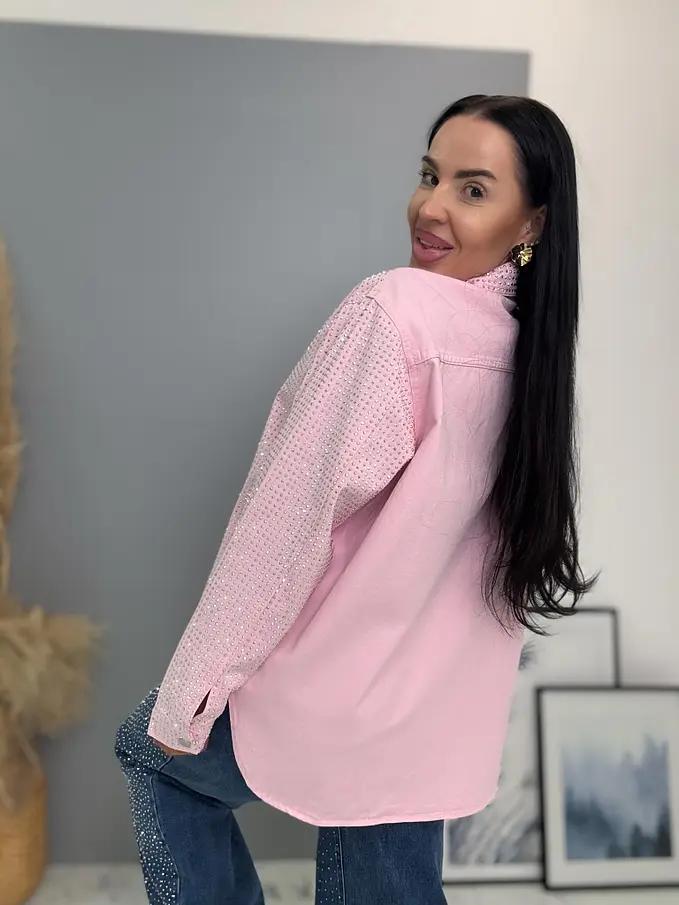 Dámska denim košeľa s ozdobnými kamienkami. Materiál nie je elastický. Zapínania na spony sú striebornej farby.