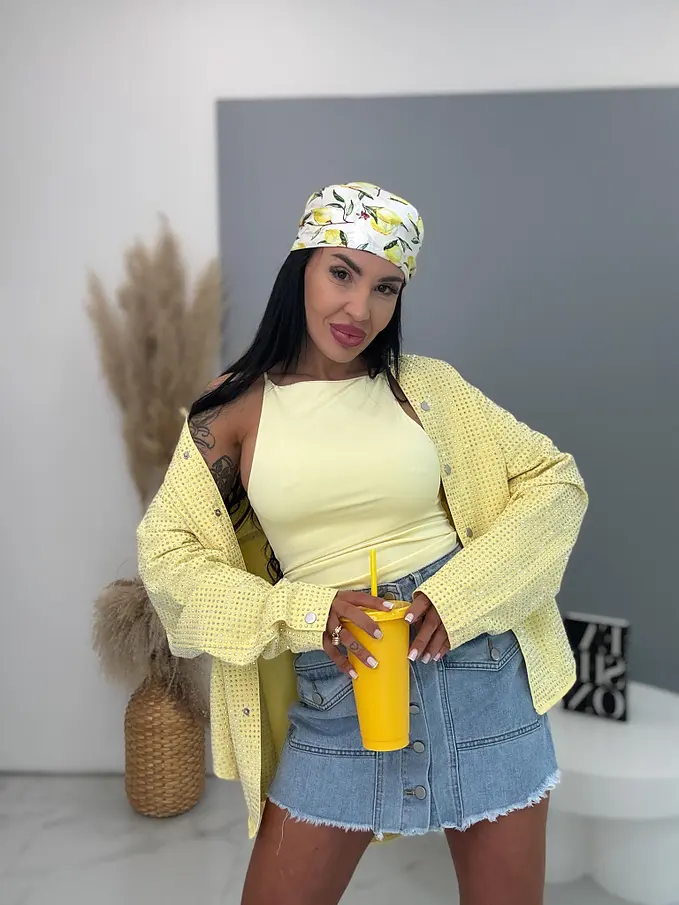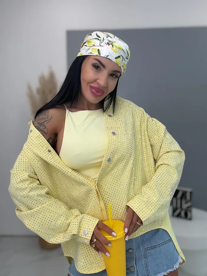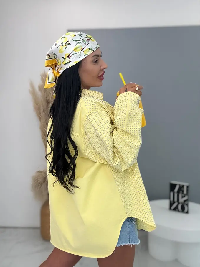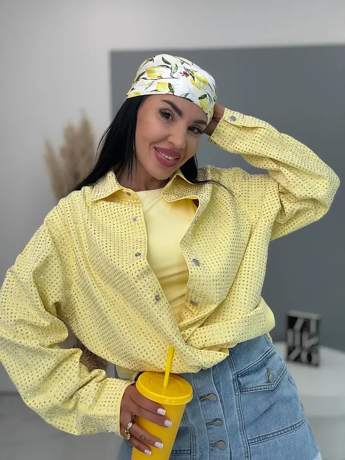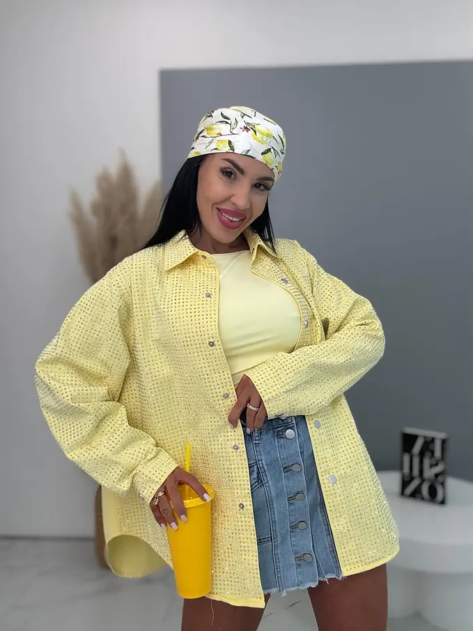Dámska denim košeľa s ozdobnými kamienkami. Materiál nie je elastický. Zapínania na spony sú striebornej farby.