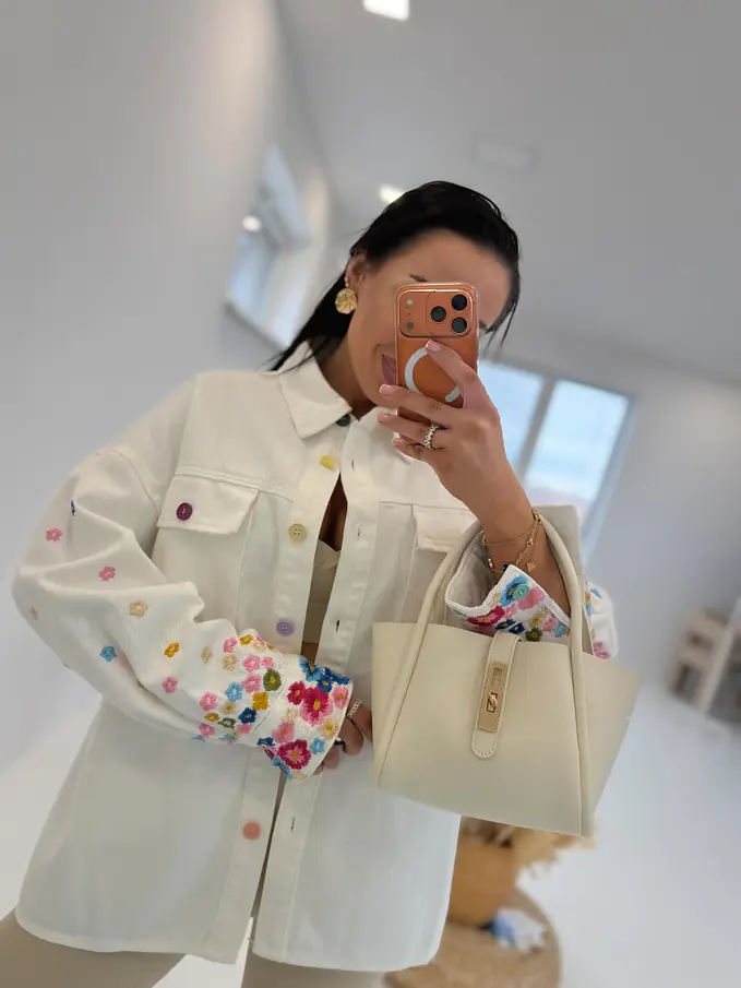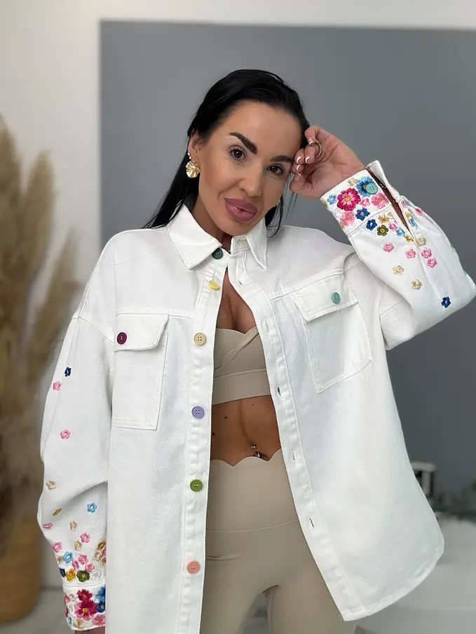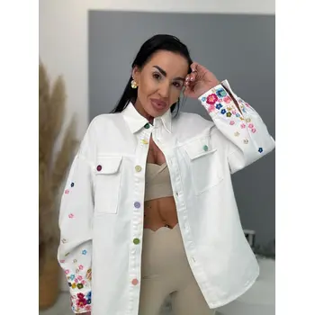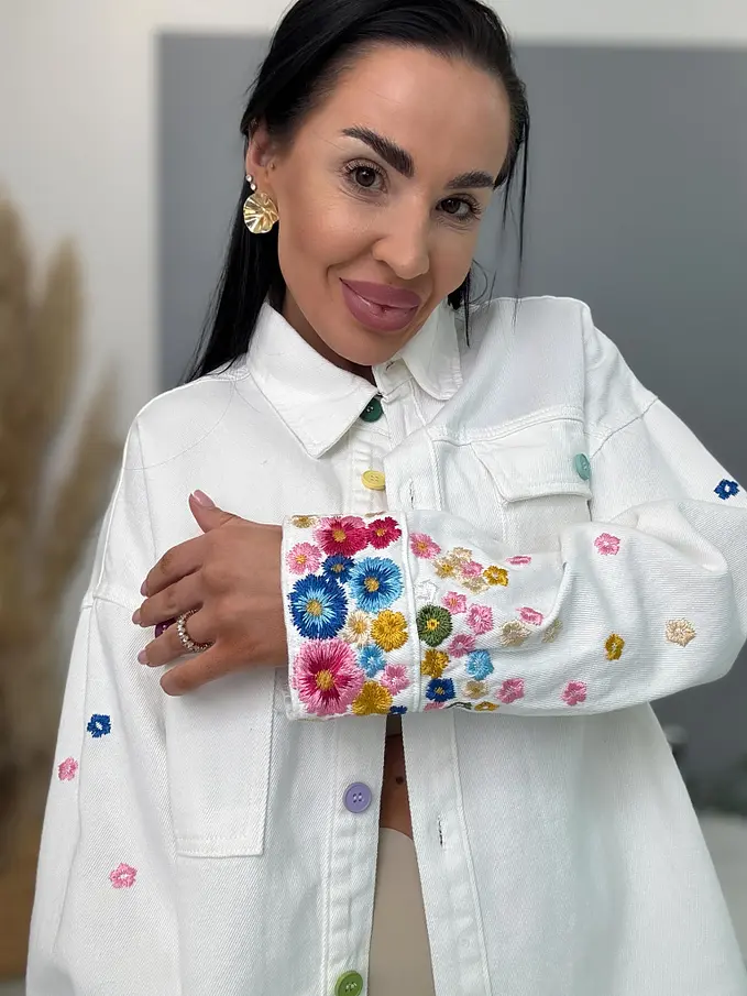Denimový košeľový kabát s kvetinovou výšivkou RELIA