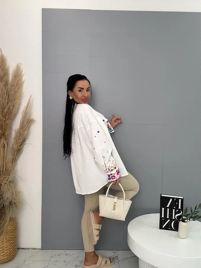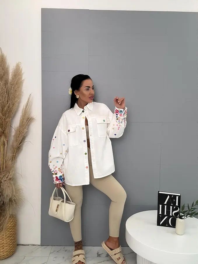 Dámska denim košeľa s kvetinovou výšivkou. Materiál nie je elastický. Zapínania na farebné gombíky.