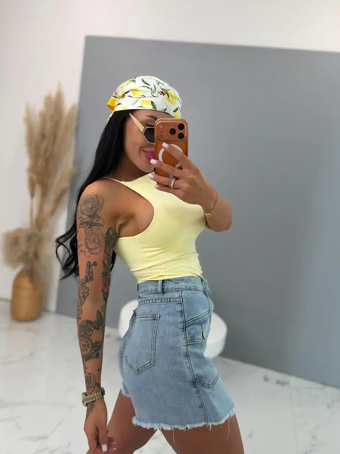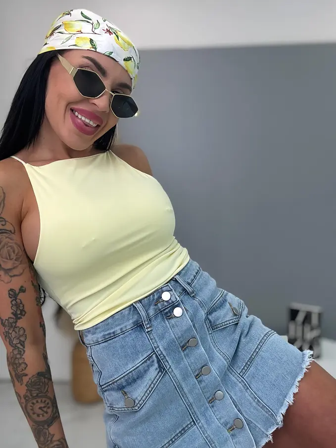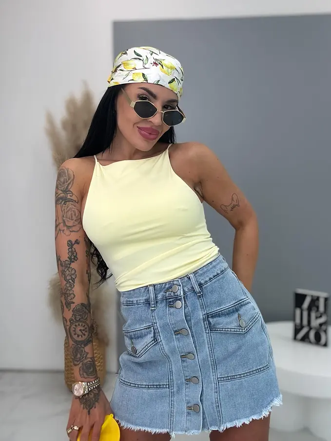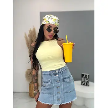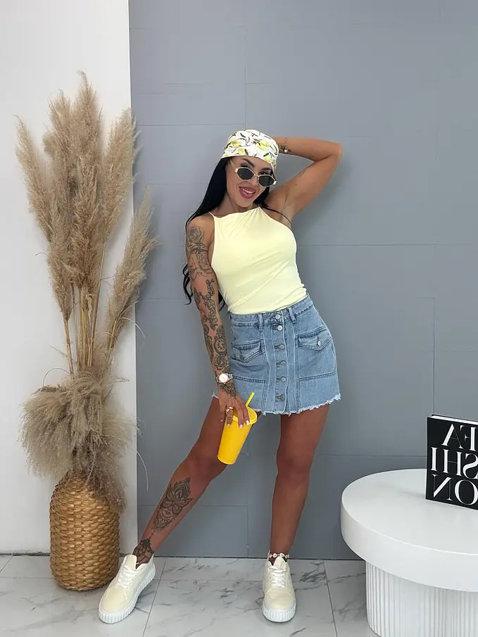 Premium kvalita. Tento denimový skort je dokonalou kombináciou sukne a krátkych nohavíc: vpredu pôsobí ako sukňa, vzadu pohodlné šortky. Celý predok je zapínaný na gombíky, ktoré majú striebornú farbu. Skort má dve predné a dve zadné vrecká. Material je elastický.