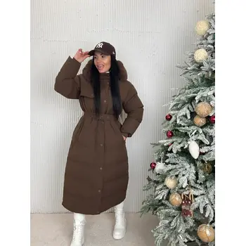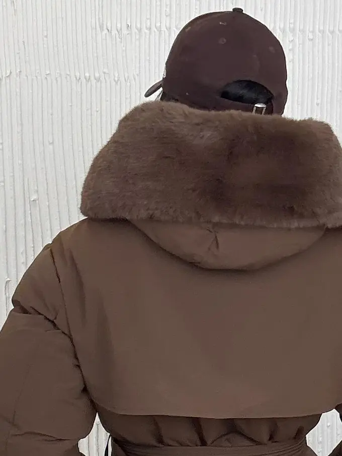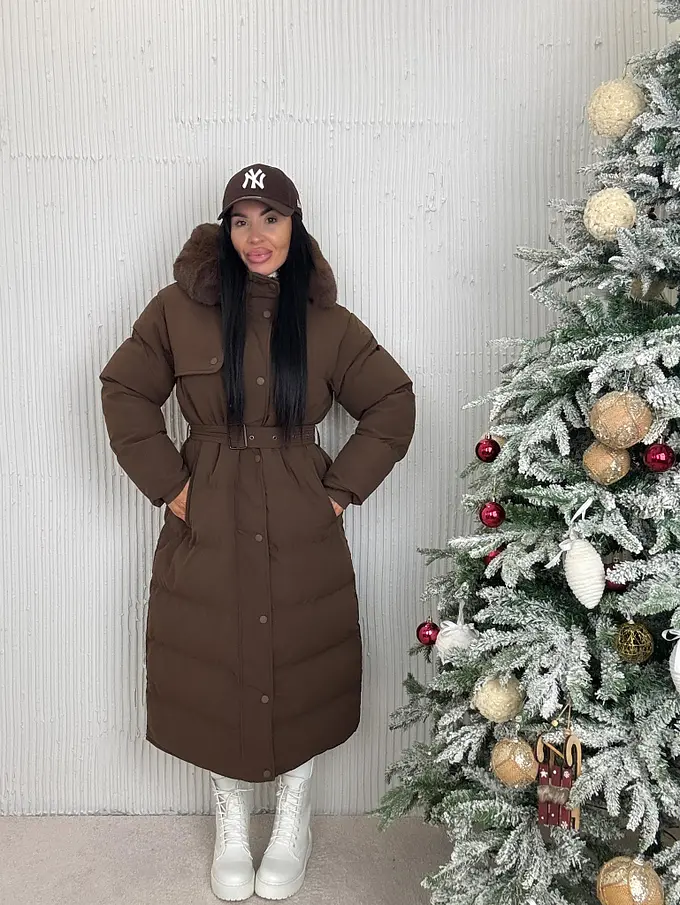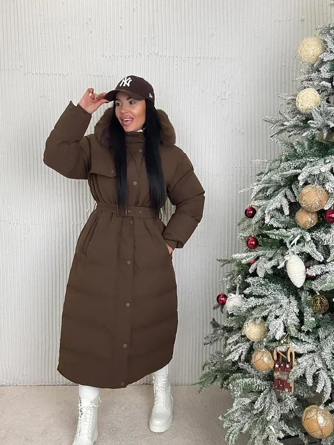 Bunda s odnímateľným kožušinovým lemom na kapucn. S neodnimateľnou kapucňou. S bočnými vreckami. Ozdoba v hnedej farbe. S opaskom.