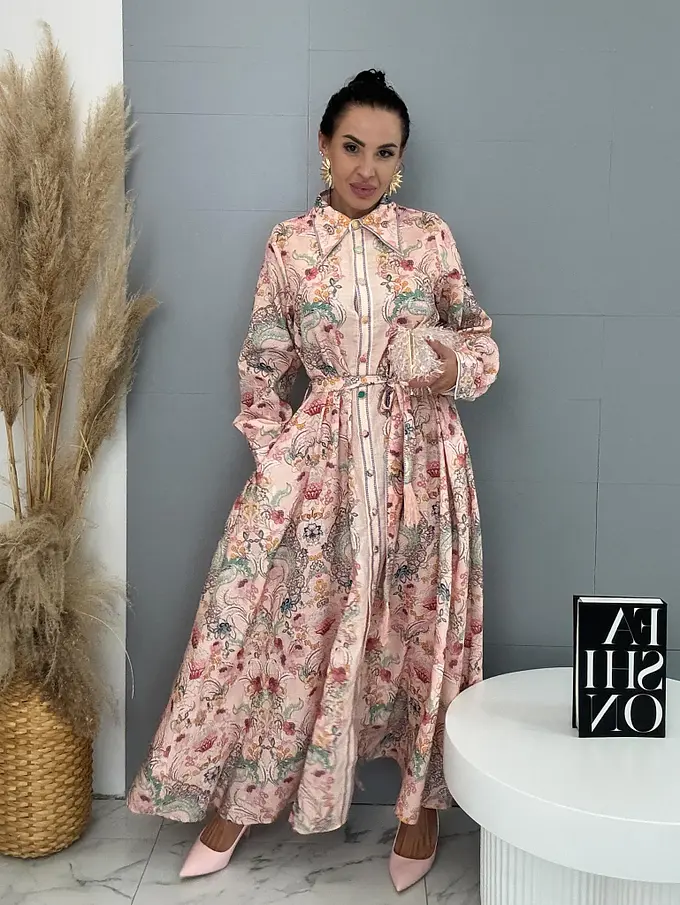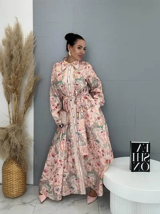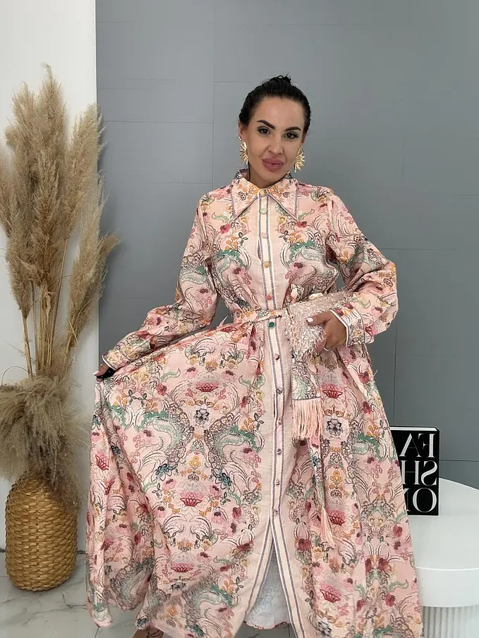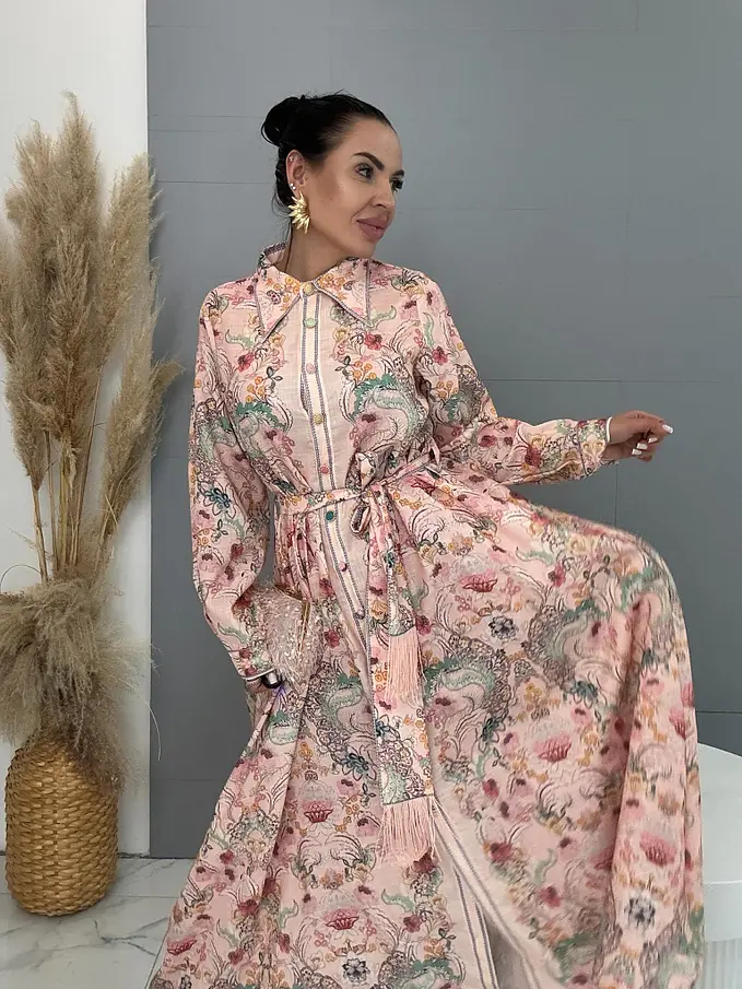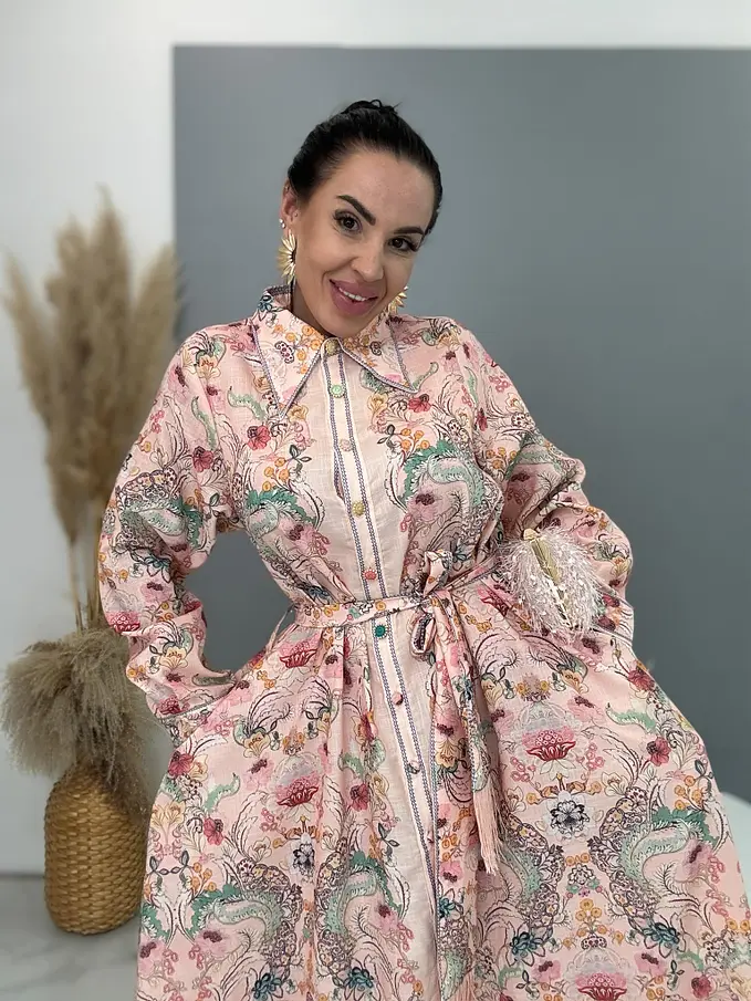 Premium kvalita. Šaty sú vyrobené z príjemného tenkého materiálu s prímesou ľanu. Material nie je elastický. Gombíky sú farebné. Opaskom a bočnými vreckami.