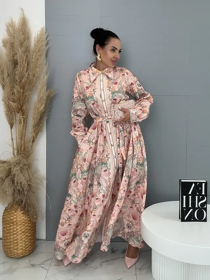 Dlhé kvetované šaty na gombíky s opaskom ROSEA