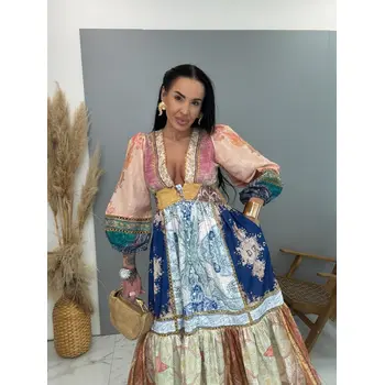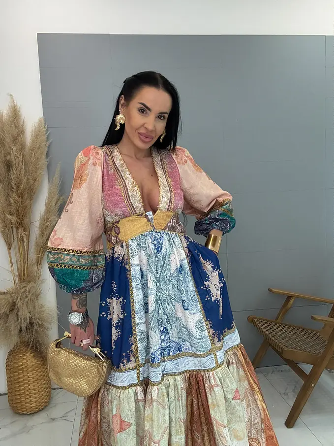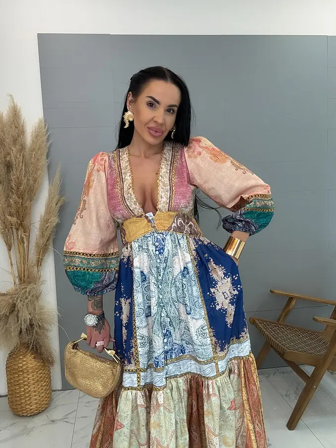 Dlhé šaty vzorované so zlatou niťou na gombíky MAGIC