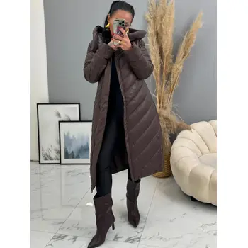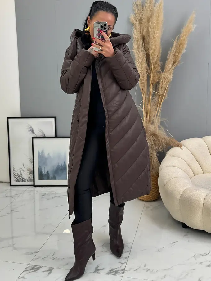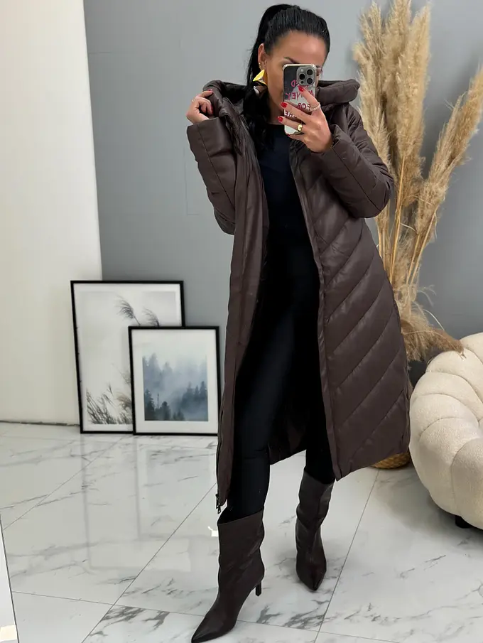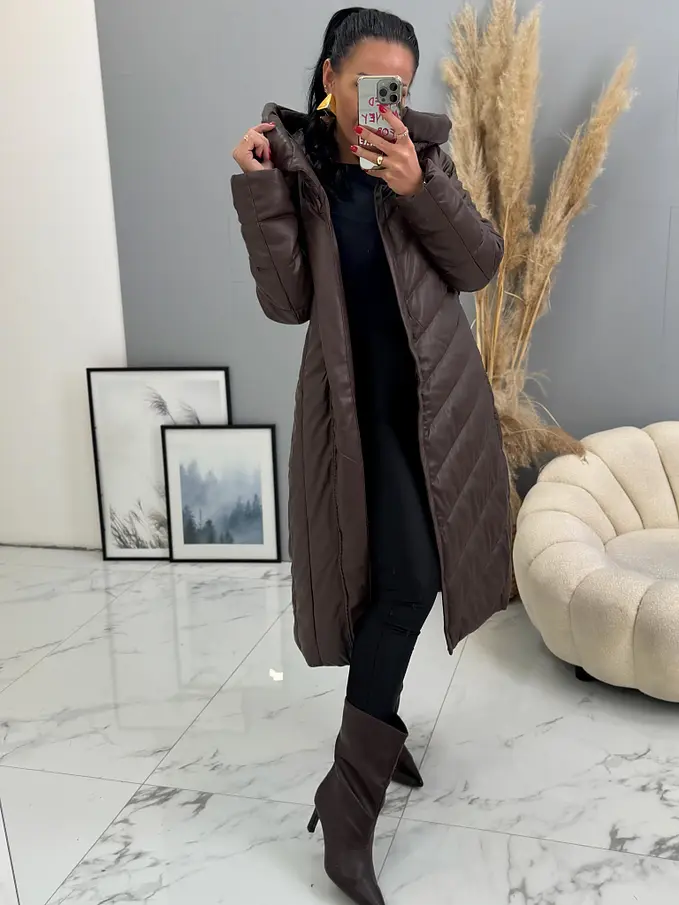 Dlhý koženkový kabát s kapucňou a opaskom JAMEA