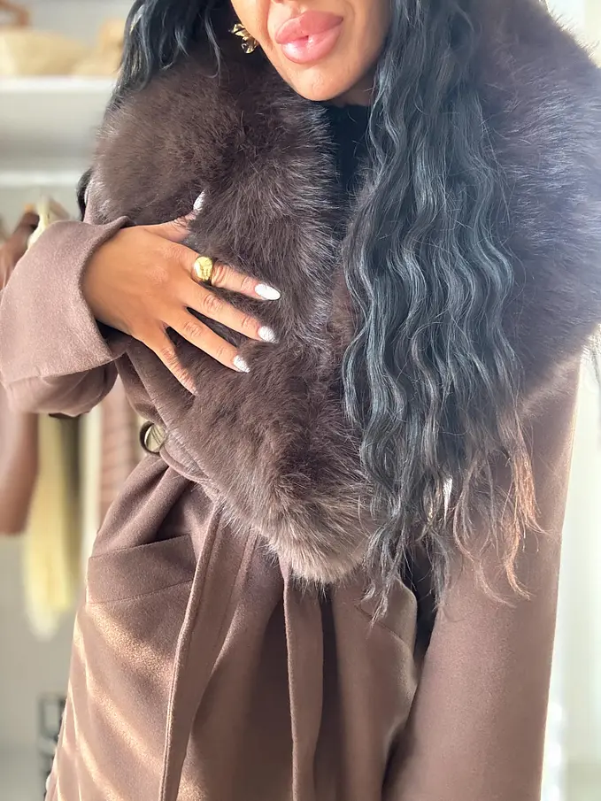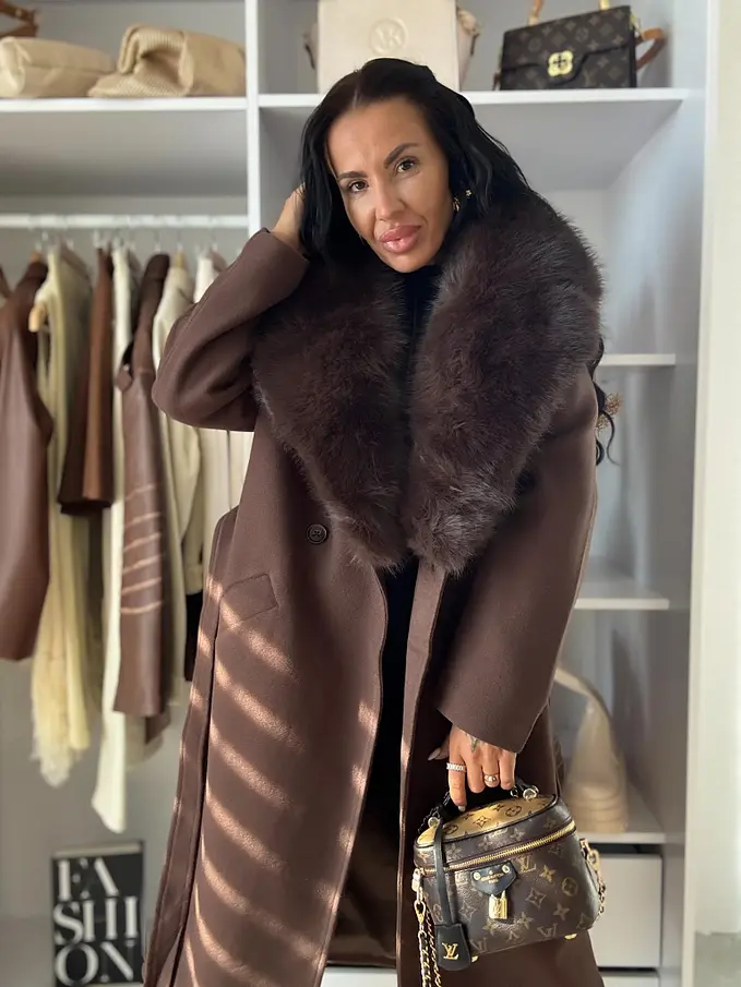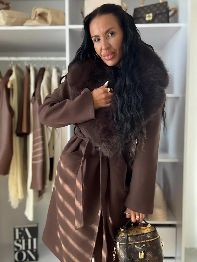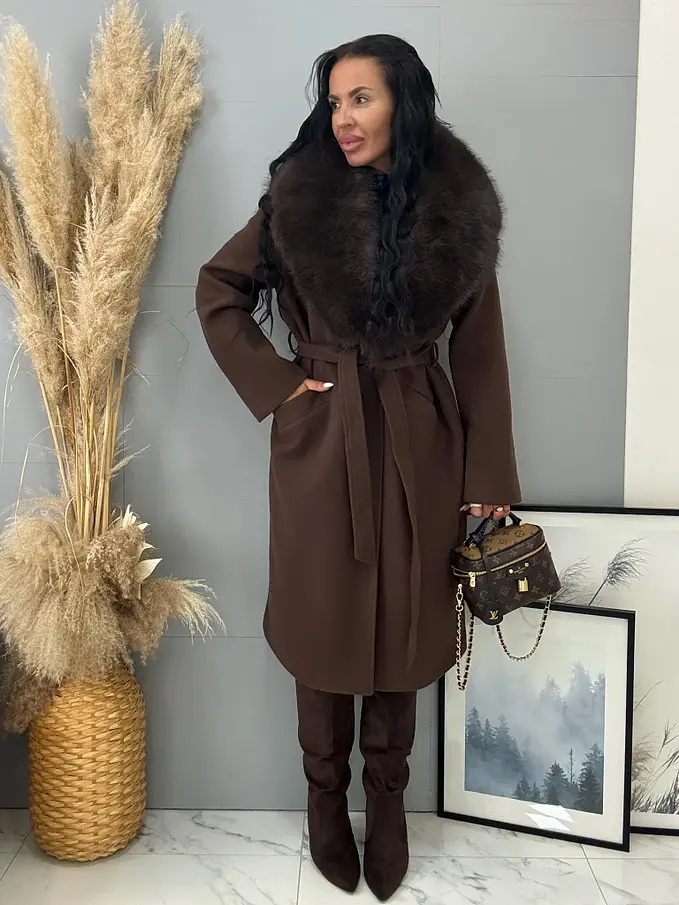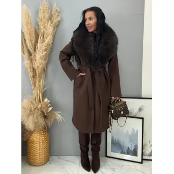 Bunda je vyrobený z príjemného materiálu. S prednými vreckami a s opaskom. S odnímateľným kožušinovým lemom na golieri.