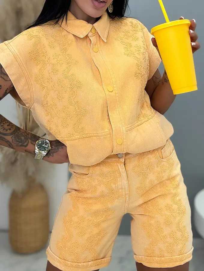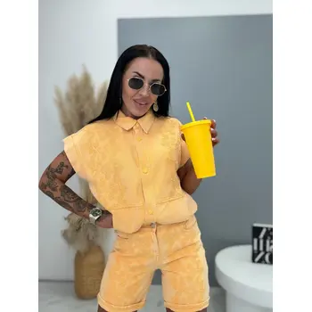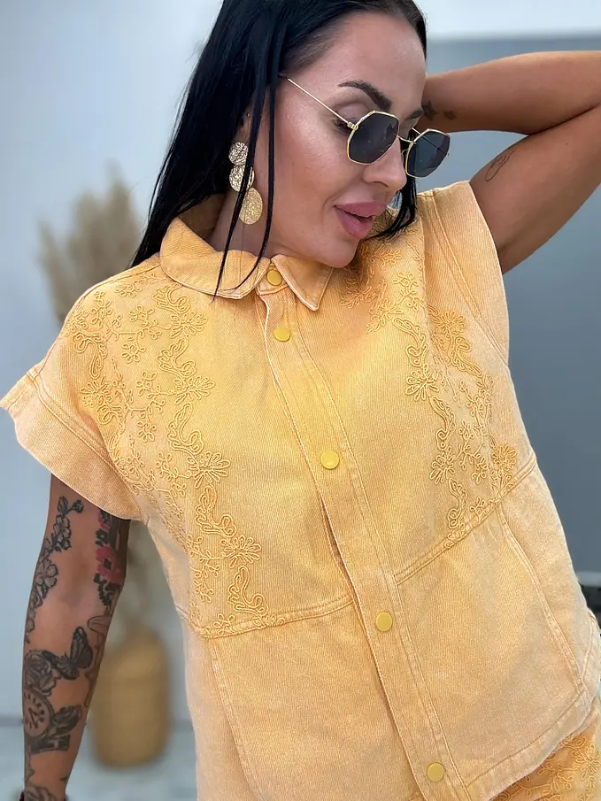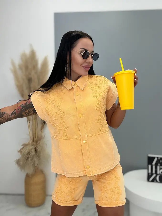 Premium kvalita. Dámsky dvojdielny denimový komplet – košeľa s krátkym rukávom a šortky. Materiál nie je elastický. Košeľa sa zapína na cvoky a je zdobená výšivkou. Šortky s výšivkou a praktickými funkčnými vreckami.