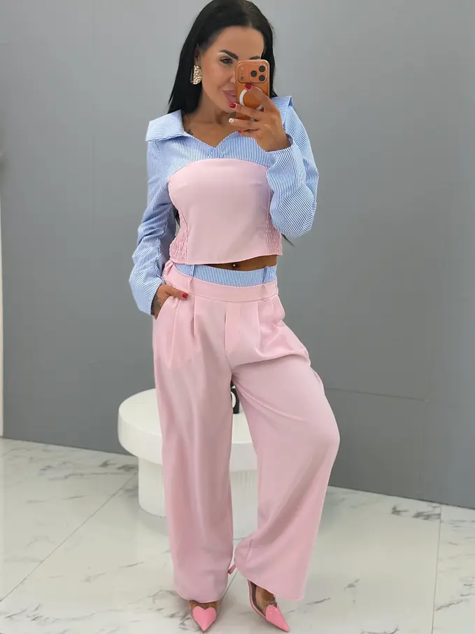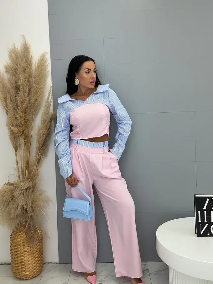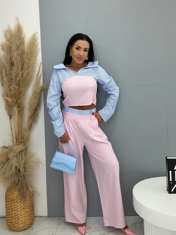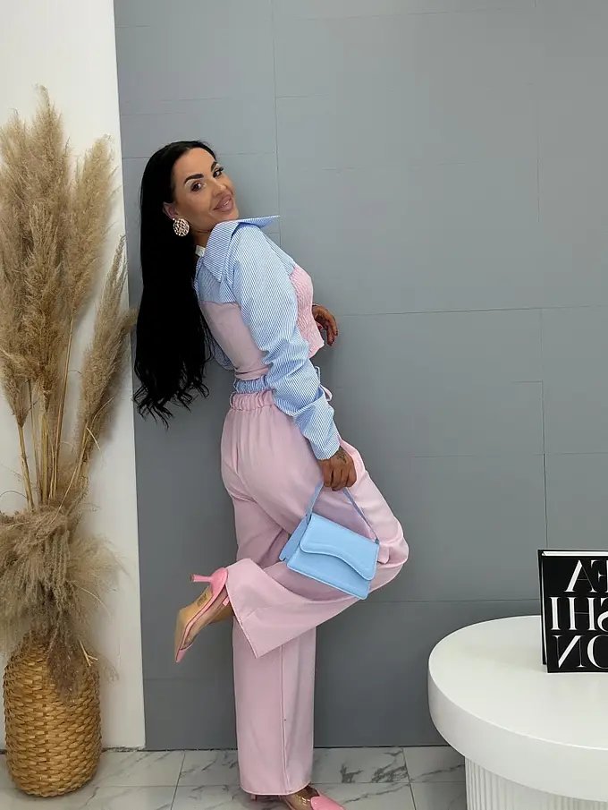 Elegantný a pohodlný komplet, ktorý sa pozostáva z blúzky a nohavíc. Materiál je príjemný ľahký. Blúzka s gumenou vsadkou na bočnej strane. Nohavice s bočnými vreckami a elastickým pásom.