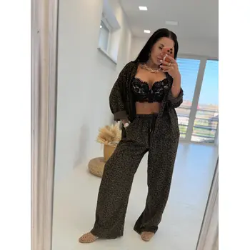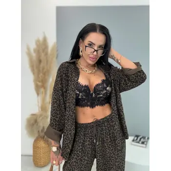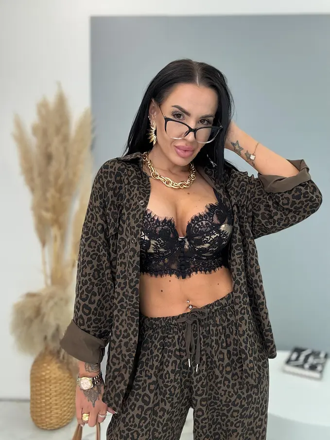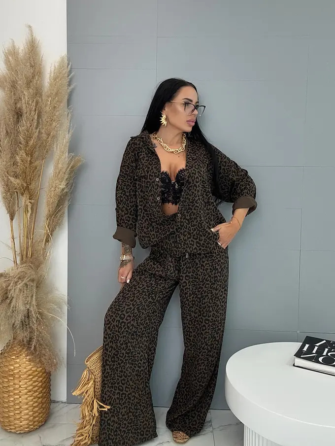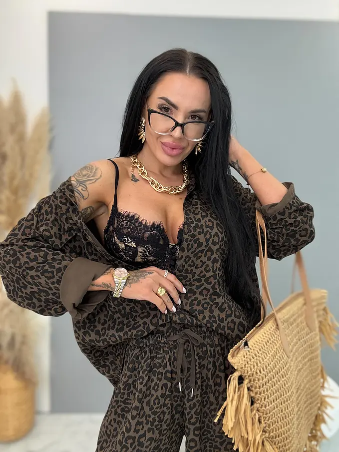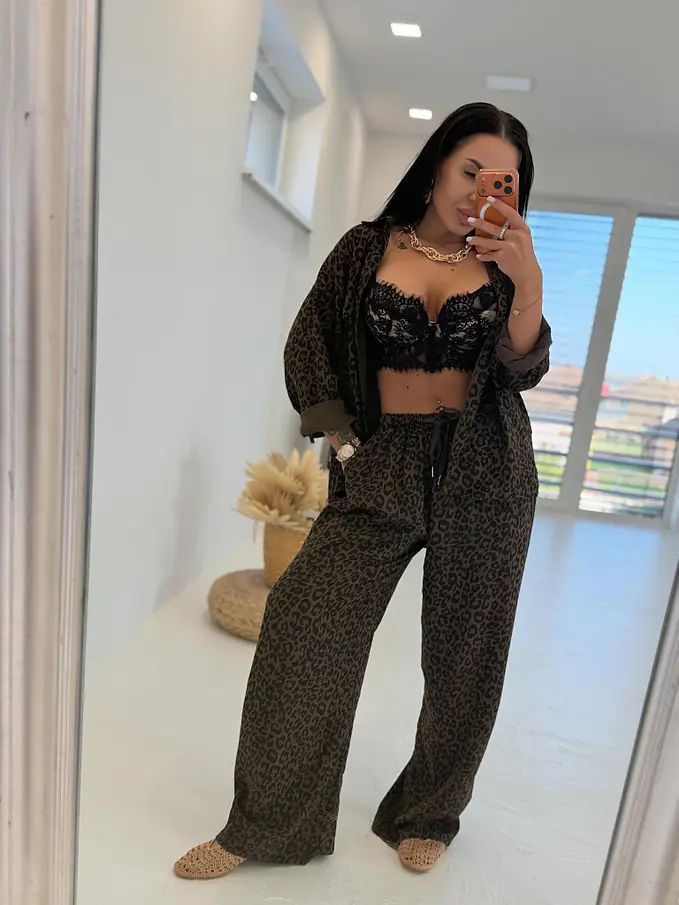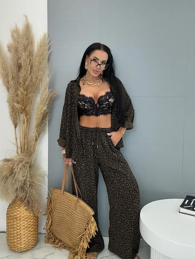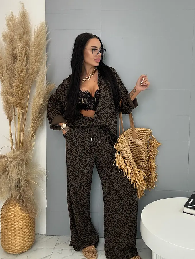 Dvojdielny komplet s leopardím vzorom je ideálnou voľbou pre moderné ženy. Pozostáva z blúzky a nohavíc. Materiál je príjemný ale nie je elastický. Ľahká blúzka sa zapína na gombíky. Nohavice majú bočné vrecká, gumený pás a šnúrku na viazanie.