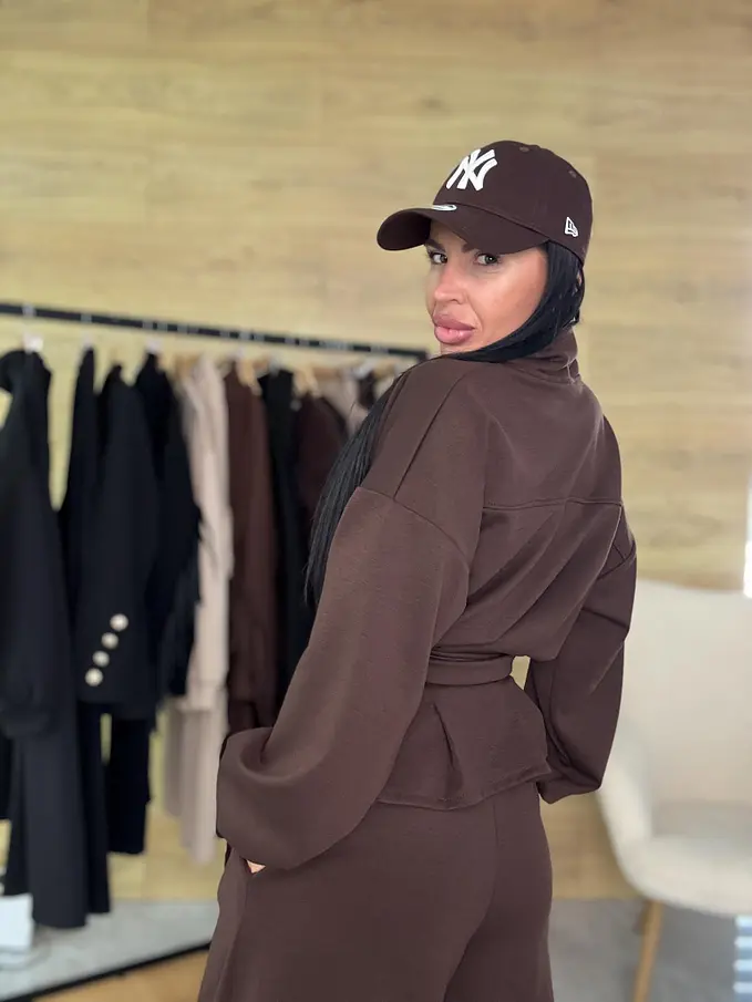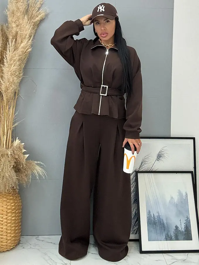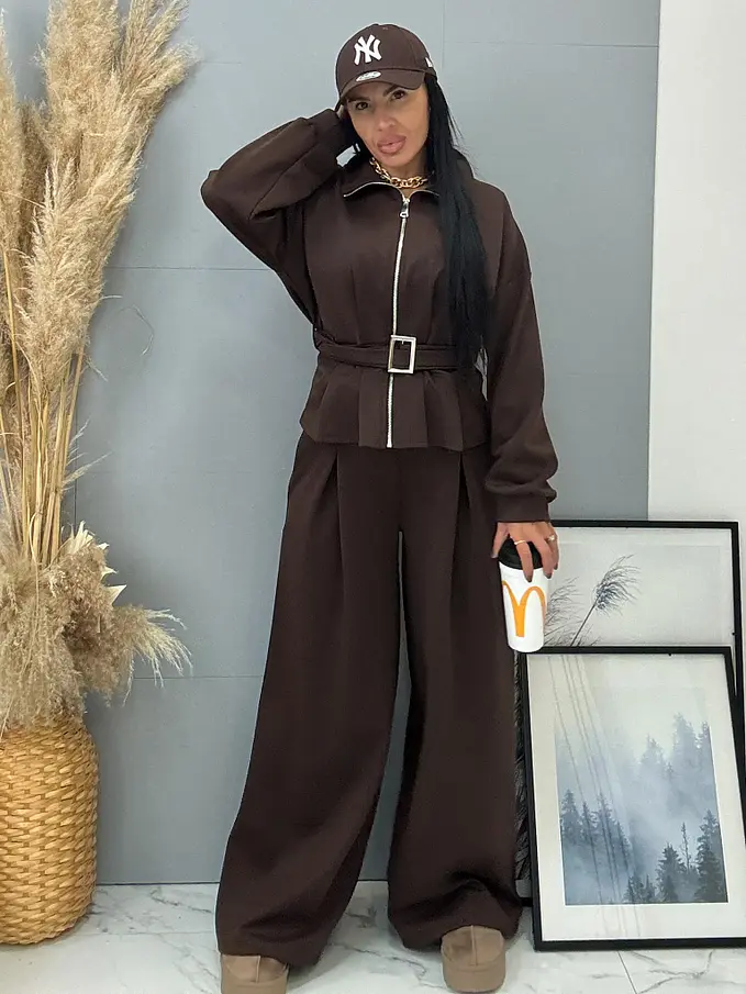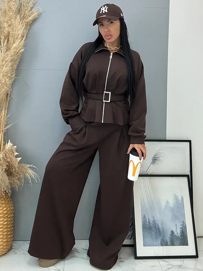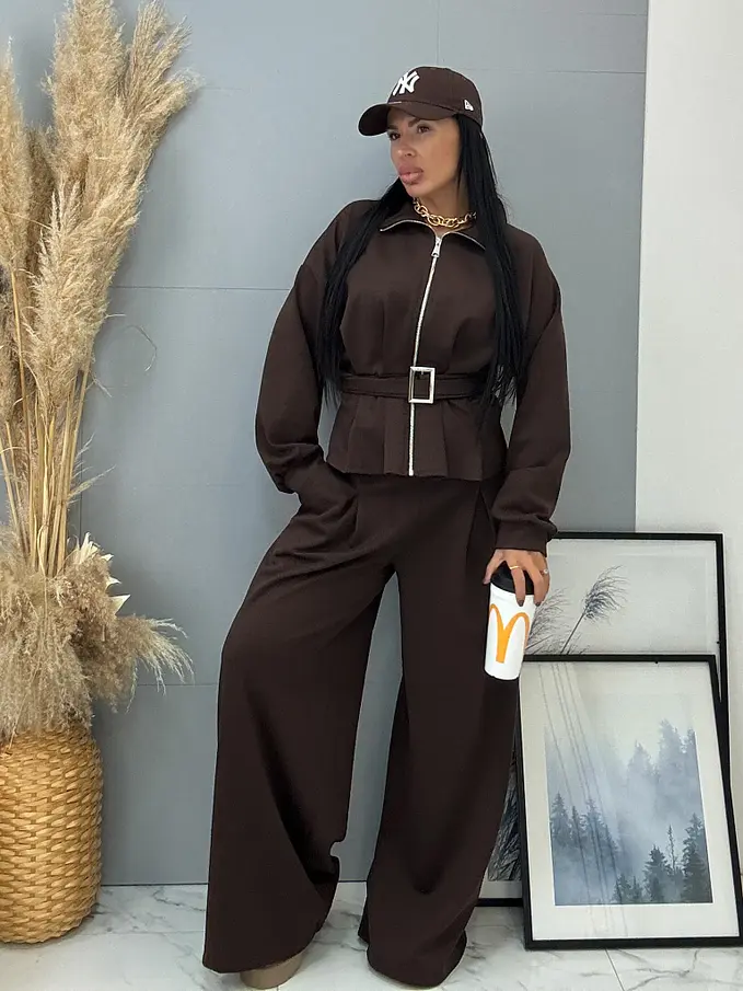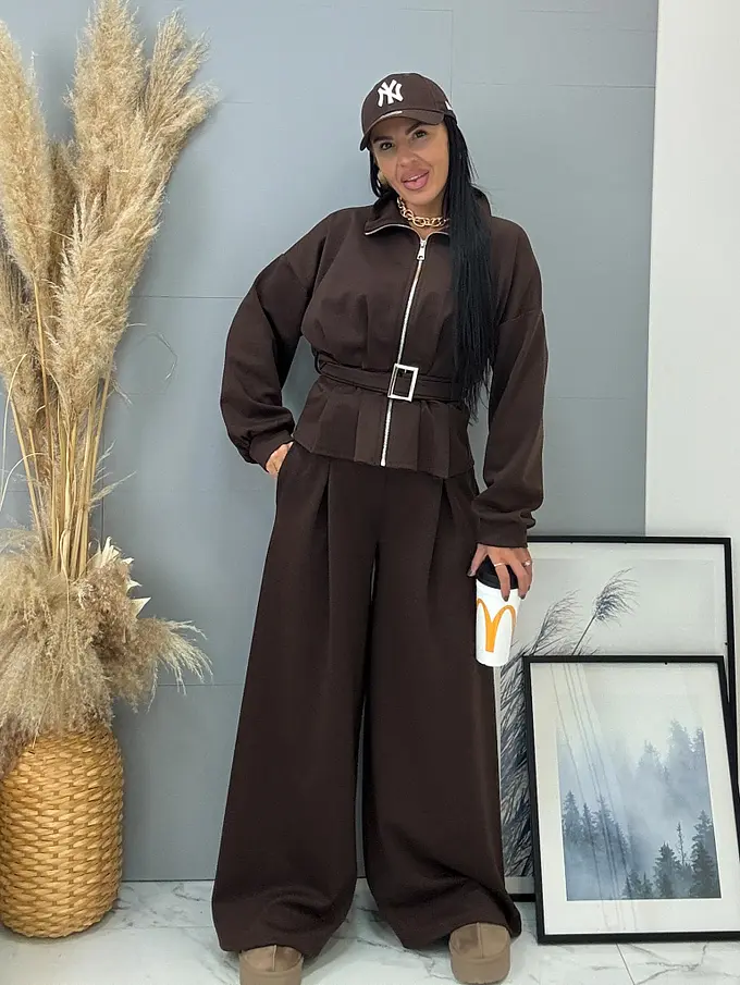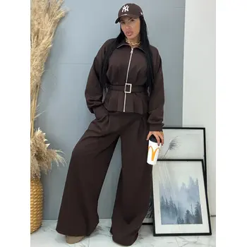 Dámský komplet z novej kolekcie. Pozozstáva z kardigánu so zipsom a opaskom a nohavíc. Materiál je príjemný, elastický. Nohavice s gumeným pásom. Ozdoba je strieborná.